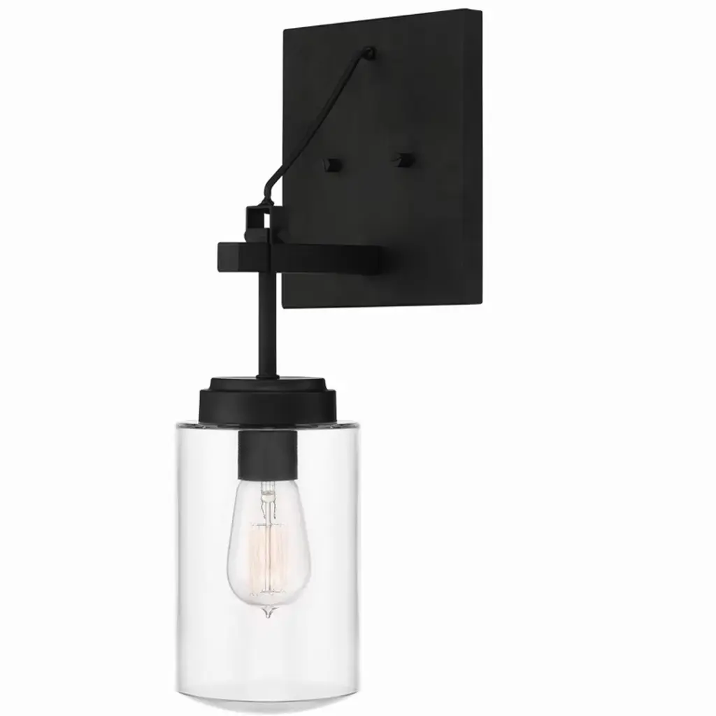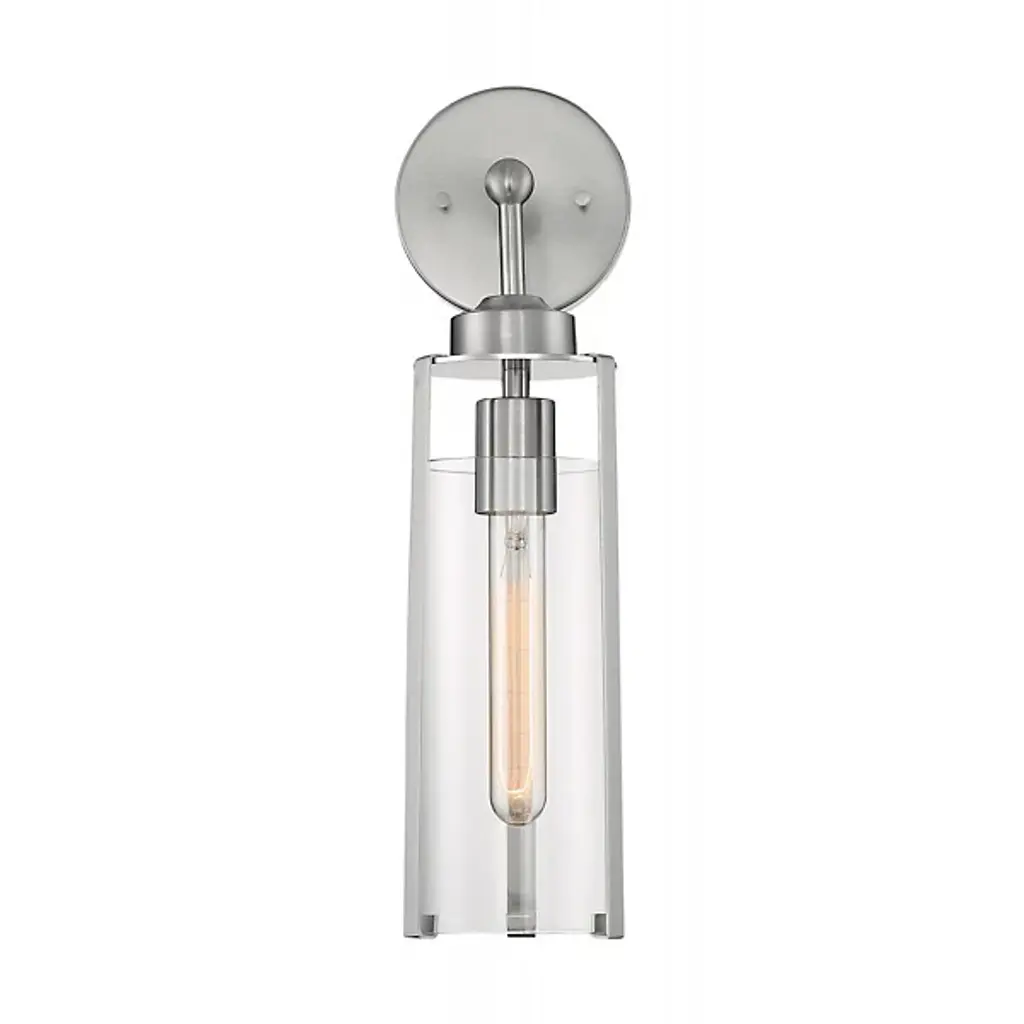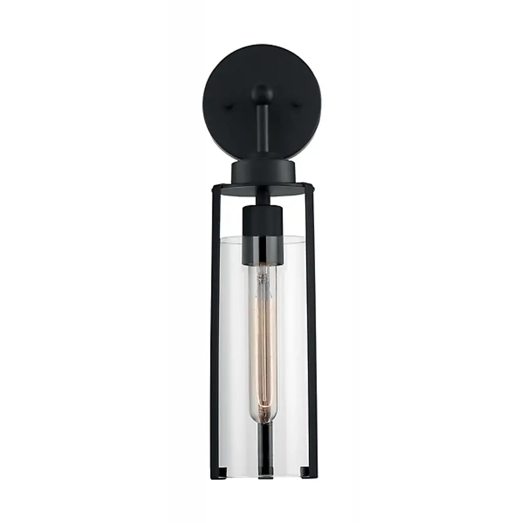 Lend an elegant emphasis to your wall and hallway spaces with the Helen Wall Sconce from Alder & Ore. A tasteful transitional fixture with modern notes, it uses a sleek steel disc to secure itself to its mounting surface, before extending a short central rod to a downward-facing single socket set inside a cylindrical shade of clear glass. A series of slender steel brackets extend down around the shade, securing the translucent shade around the damp-listed lamping, and extending a warm and welcome wash of ambiance in all directions.