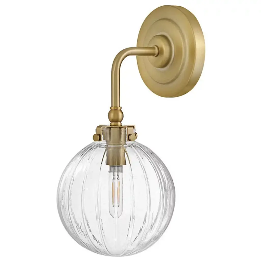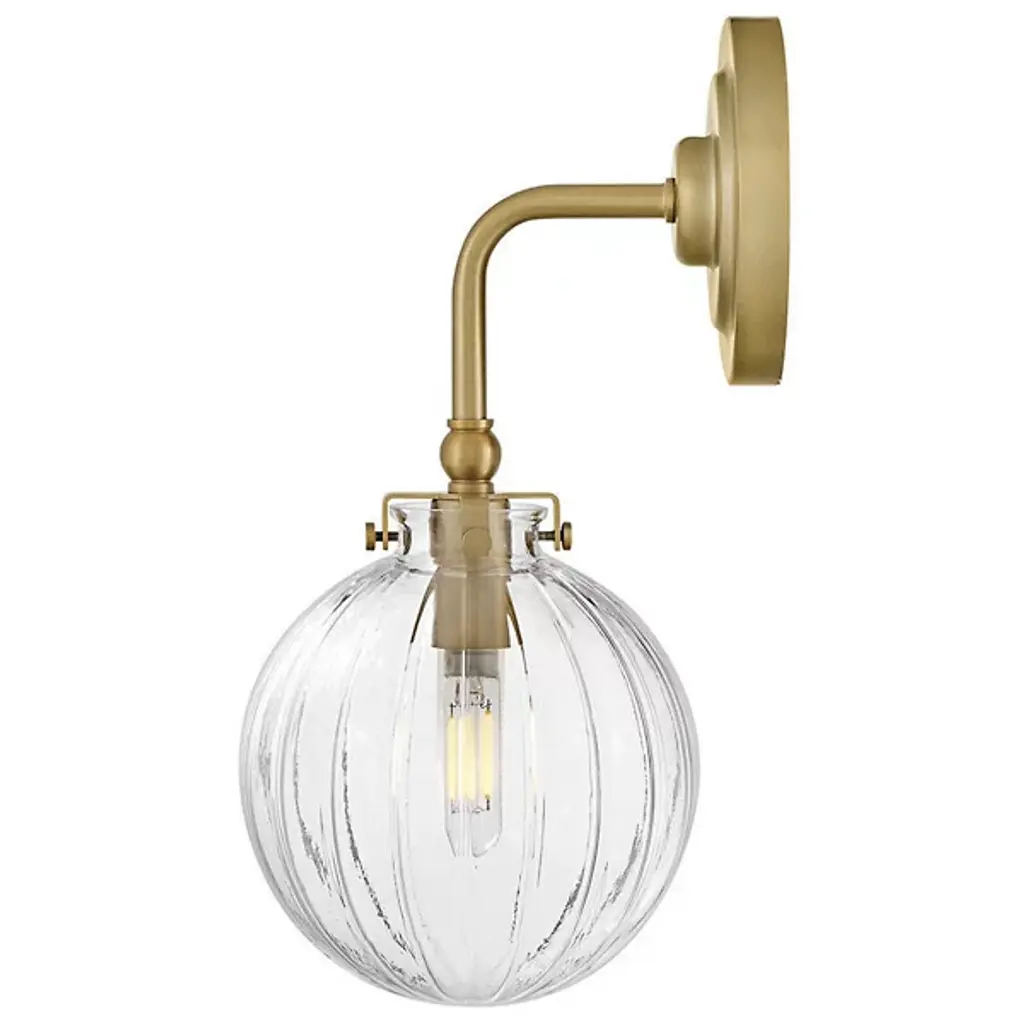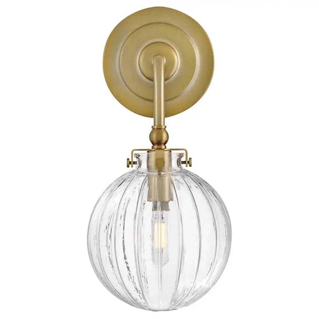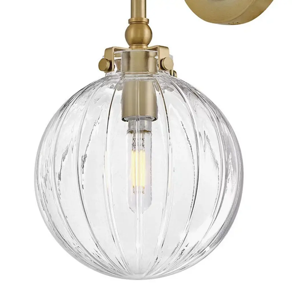 The Helene Bath Wall Sconce from Hinkley adds vintage elegance to its surroundings. A clear glass orb shade with ribbed accents adds vintage flair, accompanied by fine fittings on the slender arm that hold the shade in place. The fixture can be mounted up or down, dispensing an even ambiance through the translucent, though textured glass shade. The stepped circular wall plate coordinates well with the rounded shade, while the arcing arm adds a welcome hint of delicacy.