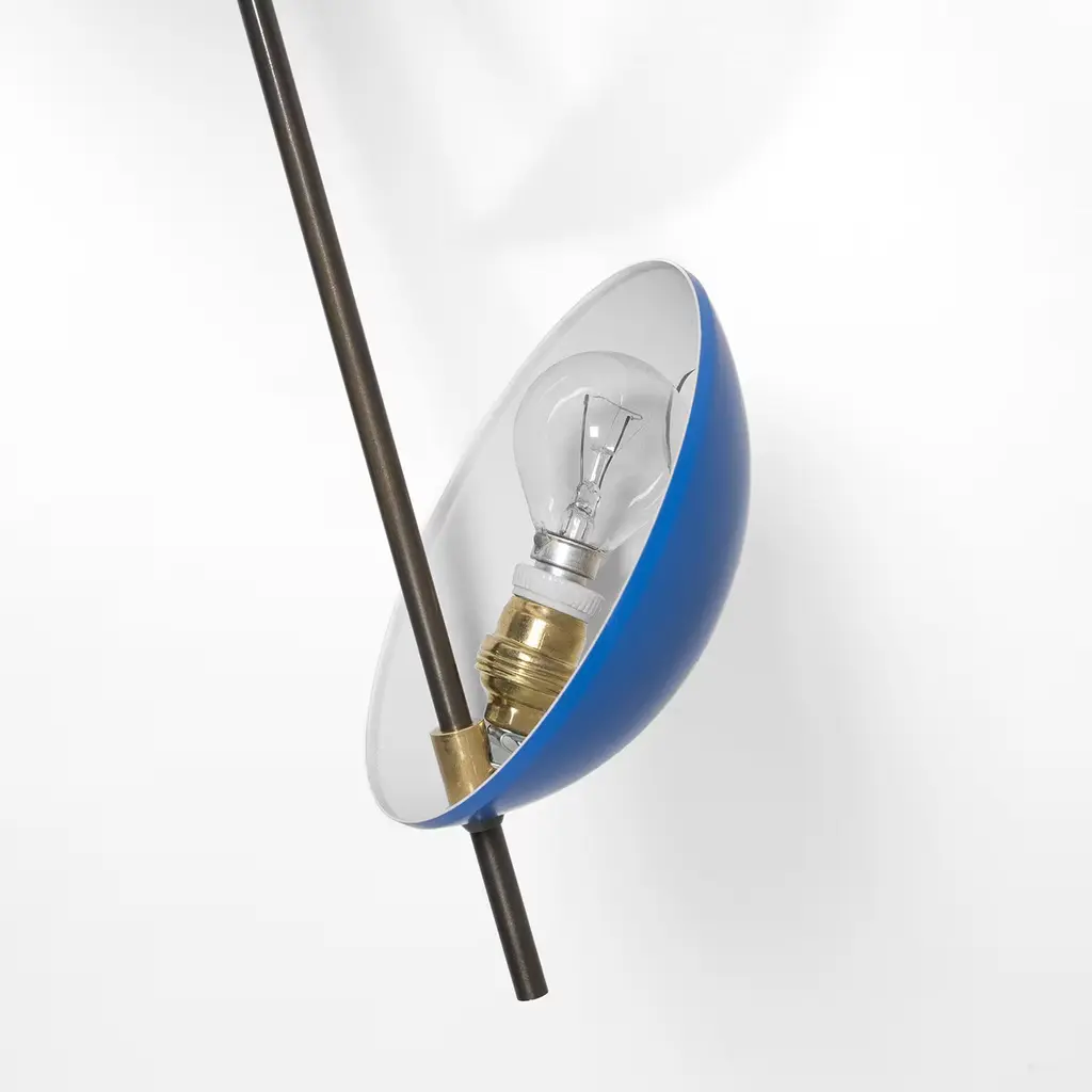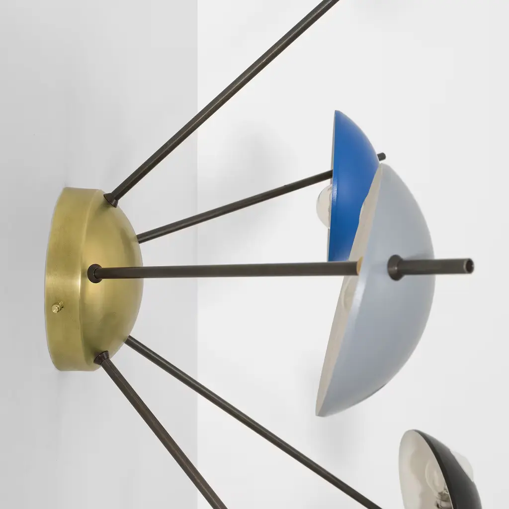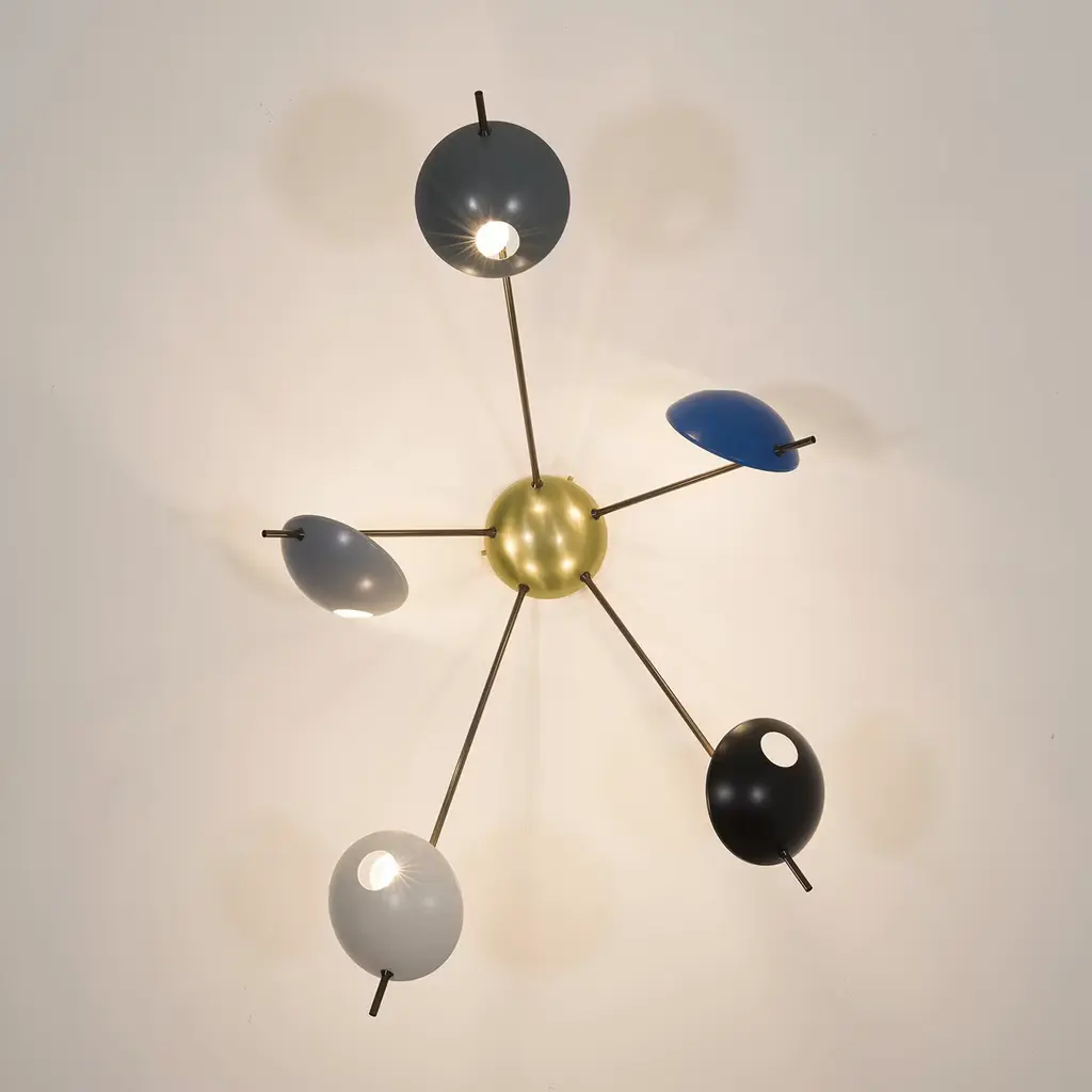 A dynamic and extremely original addition to a contemporary decor, this sculptural lamp can be used on the wall as well as on the ceiling. Entirely handcrafted of brass boasting six different finishes, it features a central burnished structure from which rise five stems holding five half-spherical shades (lightbulbs not included) curved in different directions. Available in other finishes, it can be wired for North America (110V 60 Hz - E26 socket bulbs) or Europe (220V 50Hz - E27 socket bulbs), and is also compatible with incandescent and LED bulbs.