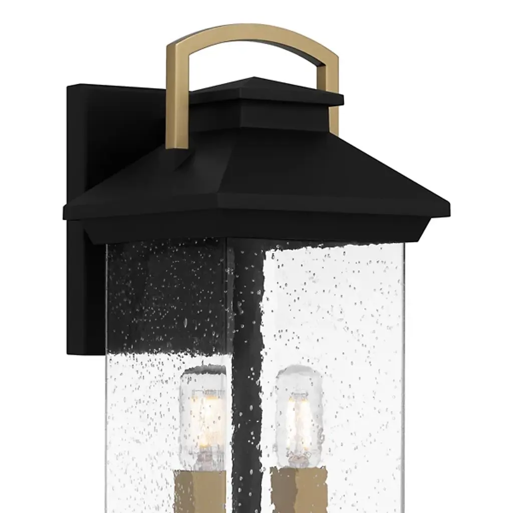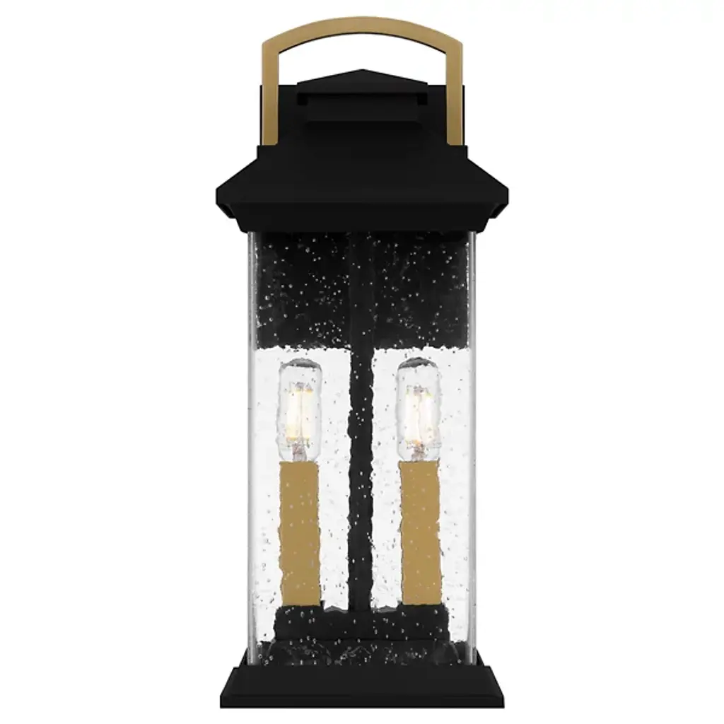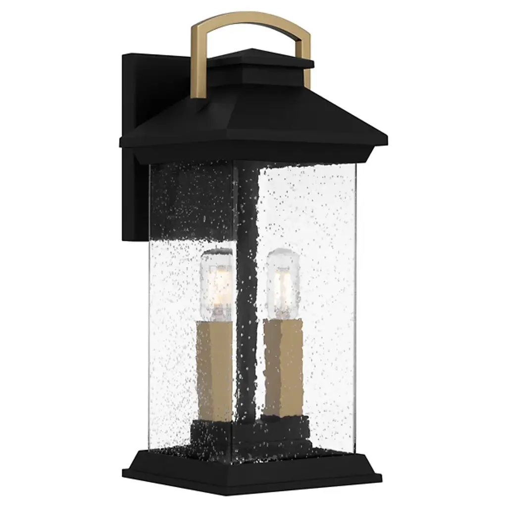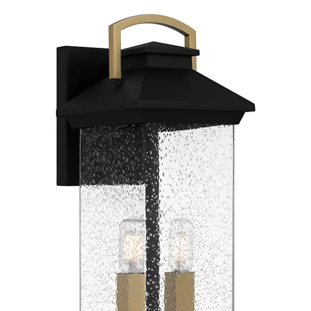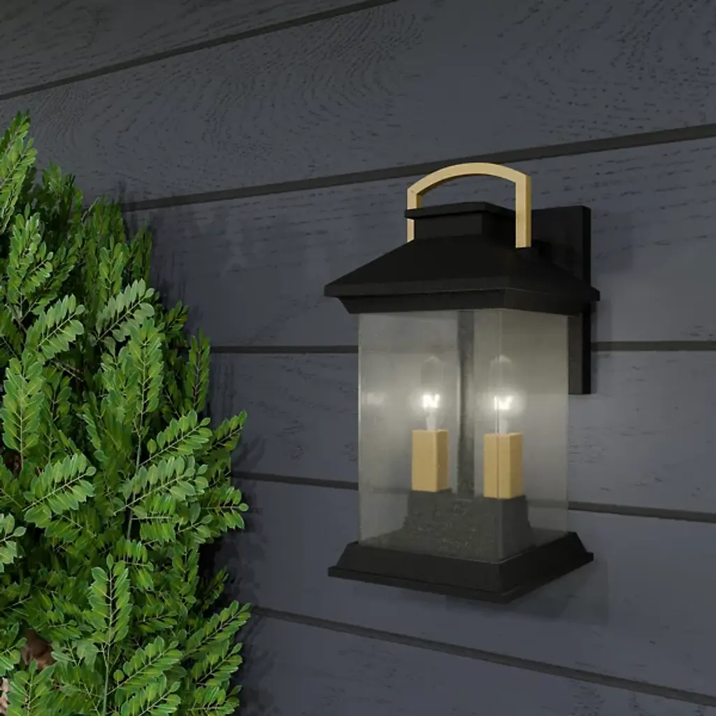 Illuminate your outdoor space with the Henderson Outdoor Wall Sconce from Quoizel, a charming addition to any home exterior. Finished in earth black and embellished with elegant gold accents, its rectangular silhouette exudes modern style and luxury. The inclusion of clear, seedy glass shades adds a touch of sparkle to the overall design, making Henderson an ideal choice for accentuating front doors or serving as porch lighting. Crafted from Coastal Armour Aluminum and wet-listed for durability, this sconce combines transitional and farmhouse styles, enhancing the aesthetic appeal of any outdoor setting while casting a gentle layer of light around it.