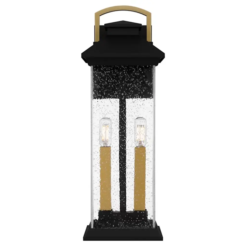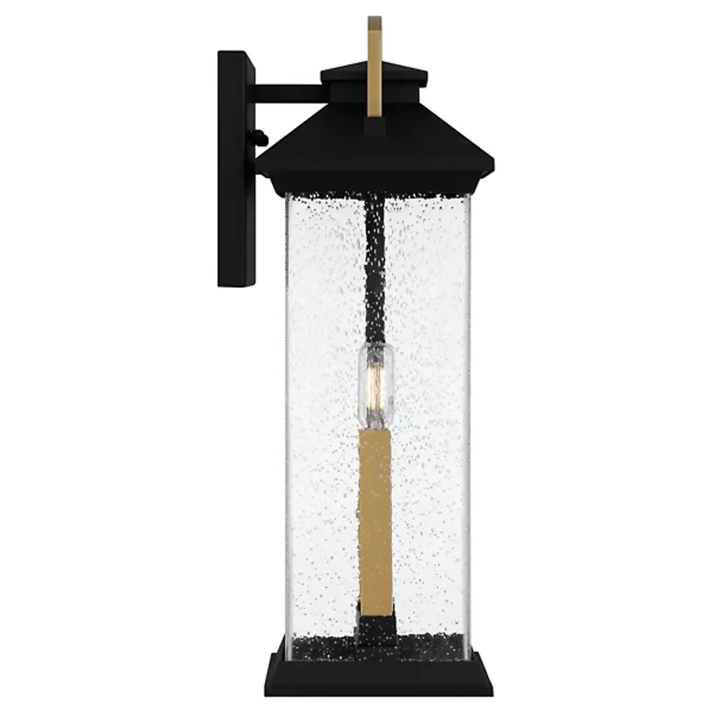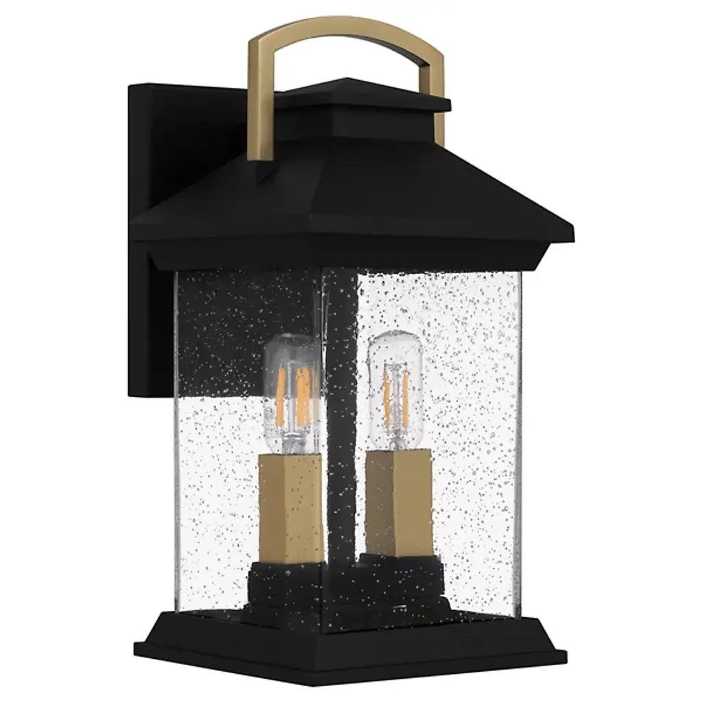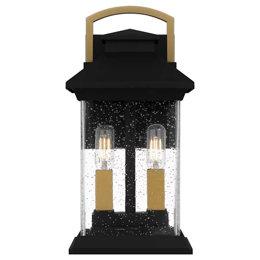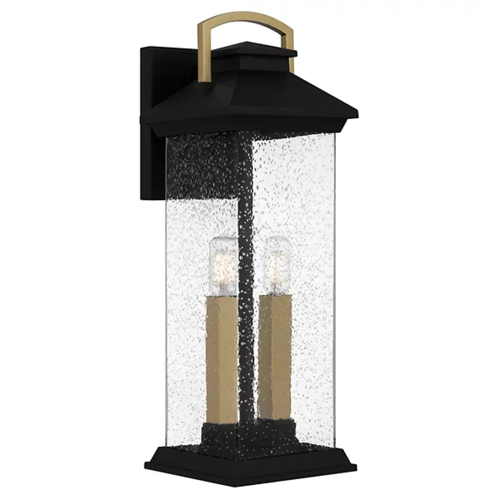 Illuminate your outdoor space with the Henderson Outdoor Wall Sconce from Quoizel, a charming addition to any home exterior. Finished in earth black and embellished with elegant gold accents, its rectangular silhouette exudes modern style and luxury. The inclusion of clear, seedy glass shades adds a touch of sparkle to the overall design, making Henderson an ideal choice for accentuating front doors or serving as porch lighting. Crafted from Coastal Armour Aluminum and wet-listed for durability, this sconce combines transitional and farmhouse styles, enhancing the aesthetic appeal of any outdoor setting while casting a gentle layer of light around it.