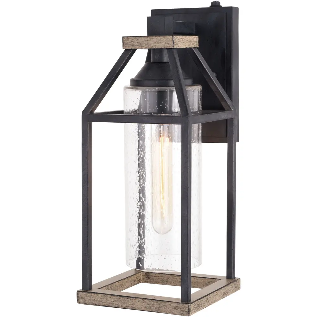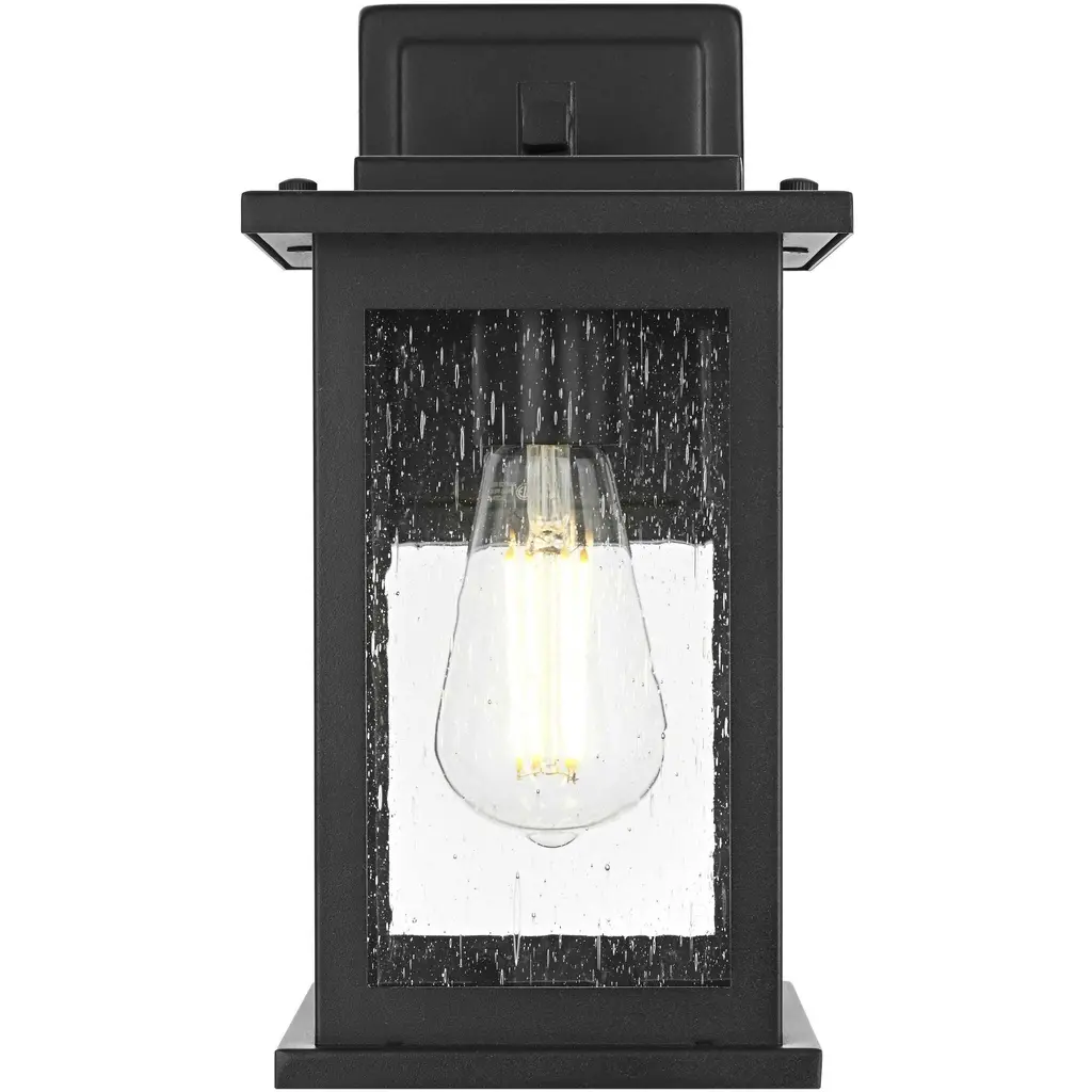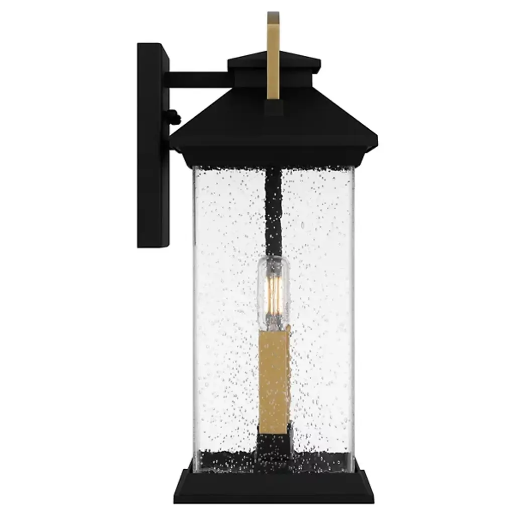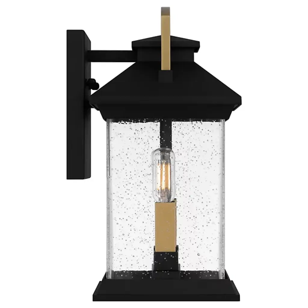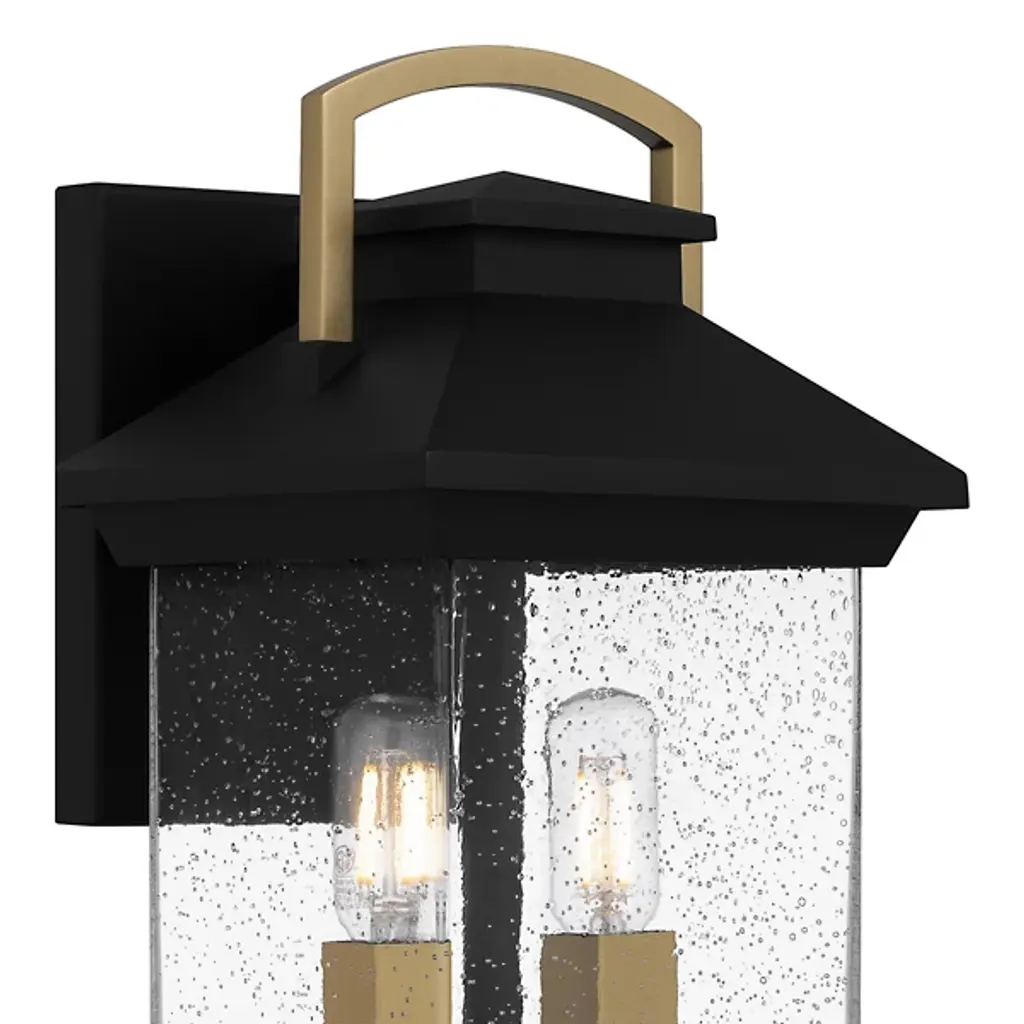 Illuminate your outdoor space with the Henderson Outdoor Wall Sconce from Quoizel, a charming addition to any home exterior. Finished in earth black and embellished with elegant gold accents, its rectangular silhouette exudes modern style and luxury. The inclusion of clear, seedy glass shades adds a touch of sparkle to the overall design, making Henderson an ideal choice for accentuating front doors or serving as porch lighting. Crafted from Coastal Armour Aluminum and wet-listed for durability, this sconce combines transitional and farmhouse styles, enhancing the aesthetic appeal of any outdoor setting while casting a gentle layer of light around it.