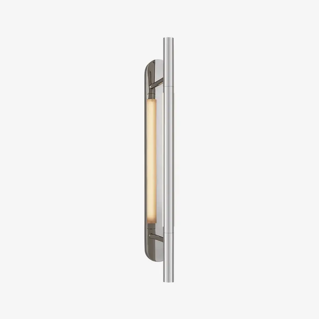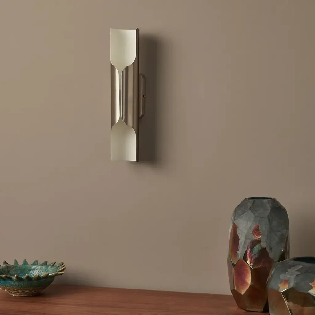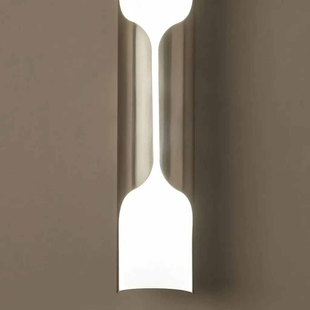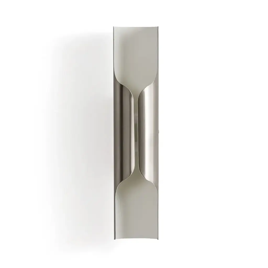 Graphic and decorative, the Henrio wall lamp and its tubular shapes recall the codes of the 1970s. Spreading soft, subdued illumination, Henrio brings a warm atmosphere to a room. The satin nickel finish of the wall lamp underlines the contemporary trend of the object.Iron exterior with satin nickel finishIron interior with white epoxy finish2 5W LED cells (non-replaceable)Light colour: warm white (3000 Kelvin)The lifetime of an integrated LED is about 25,000 hours: this is equivalent to about 20 years if the lamp is switched on for 3 hours a day