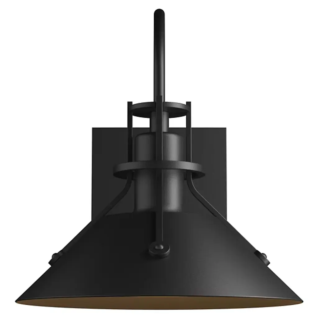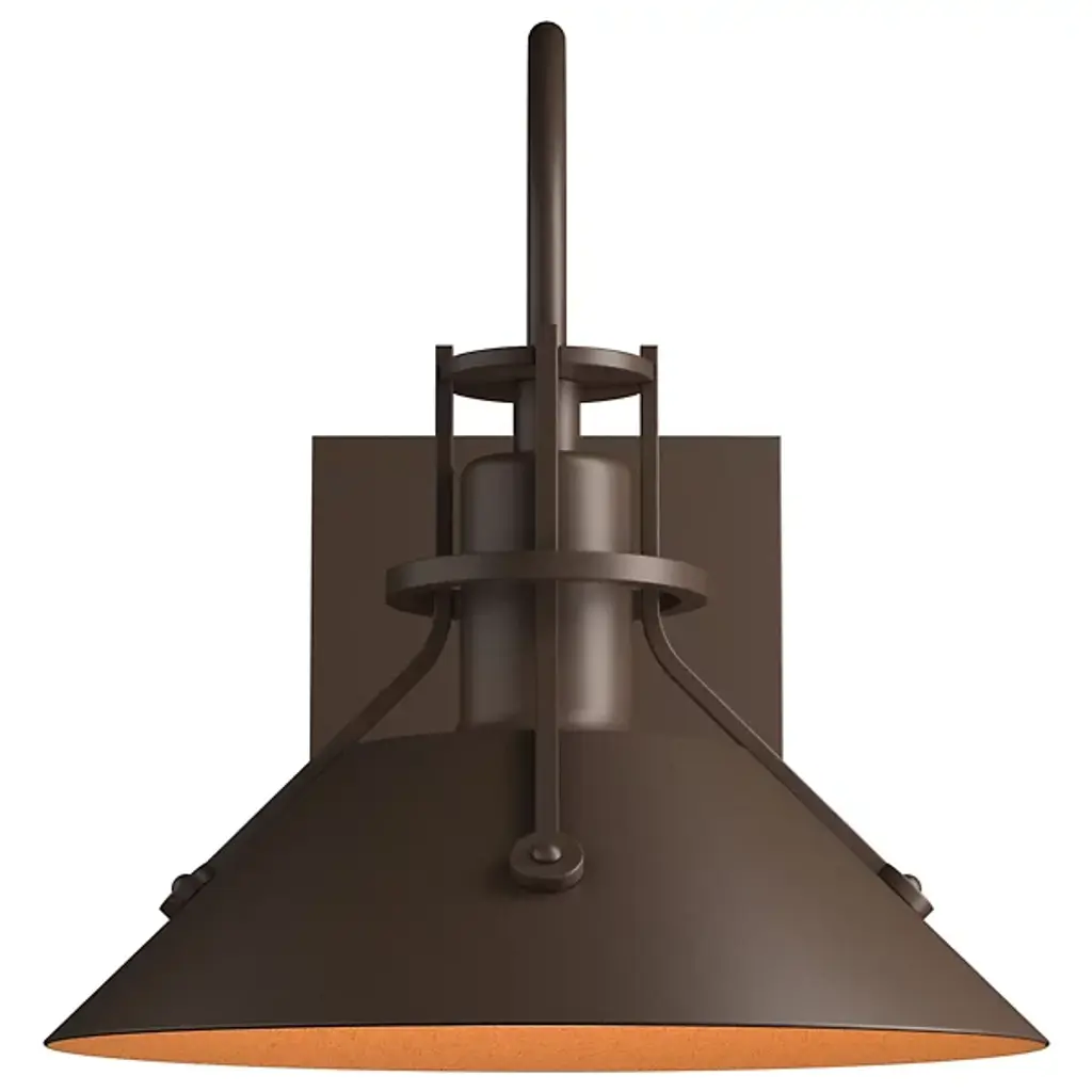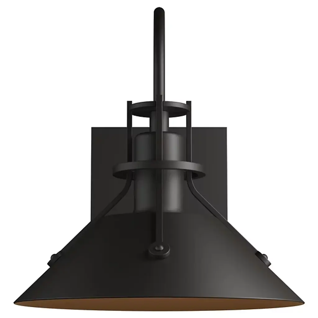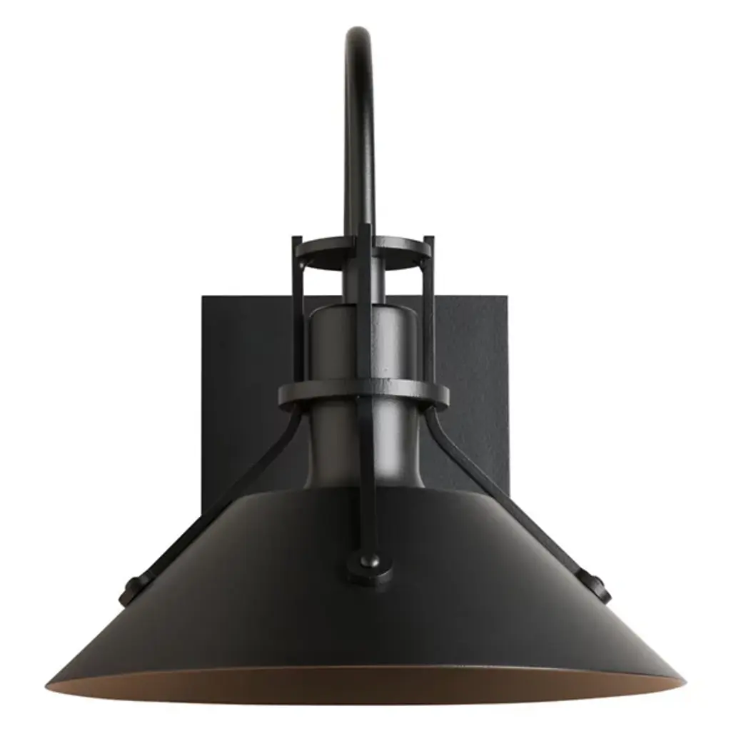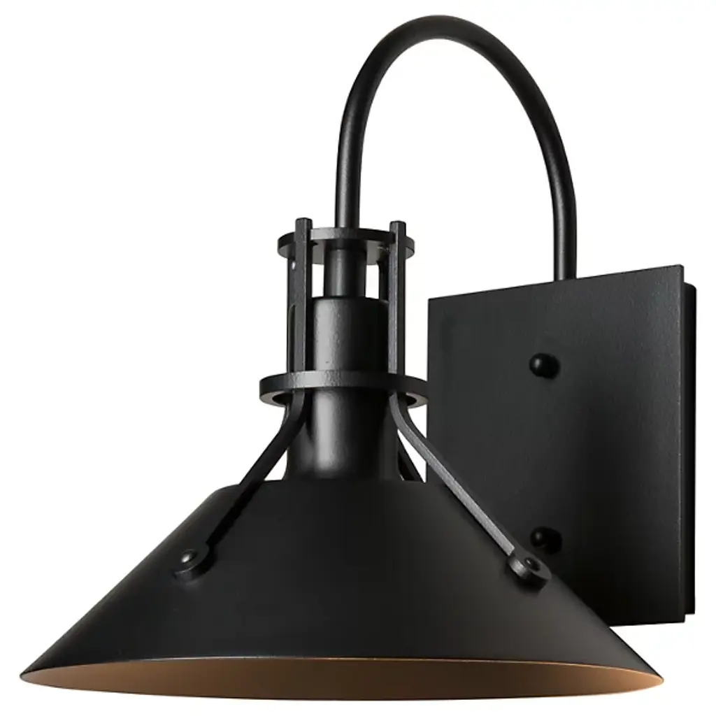 Adorn exteriors with the striking coastal style of the Henry Outdoor Wall Sconce by Hubbardton Forge. Constructed of aluminum with a unique outdoor finish specifically created to withstand harsh environmental conditions, this robust fixture brightens outdoor areas with an ample wash of warm light that beams from under a cone-shaped shade. A sharp, squared backplate supports the fixture, while a smooth gooseneck arm extends to suspend the wide shade. This fixture features a double shade to ensure uplight is blocked, offering a Dark Sky compliant lighting solution.