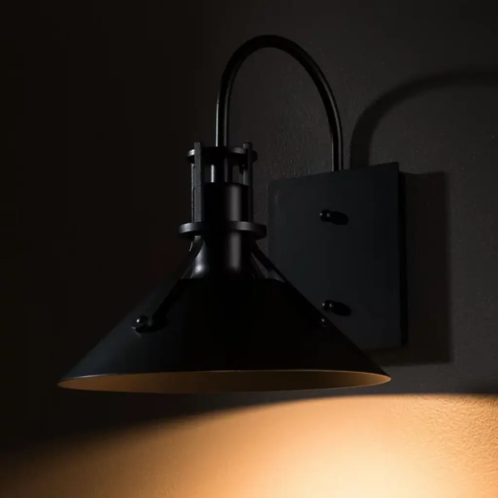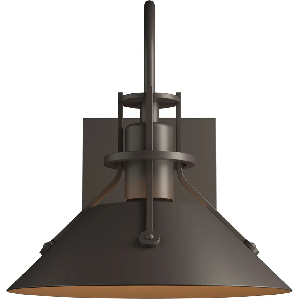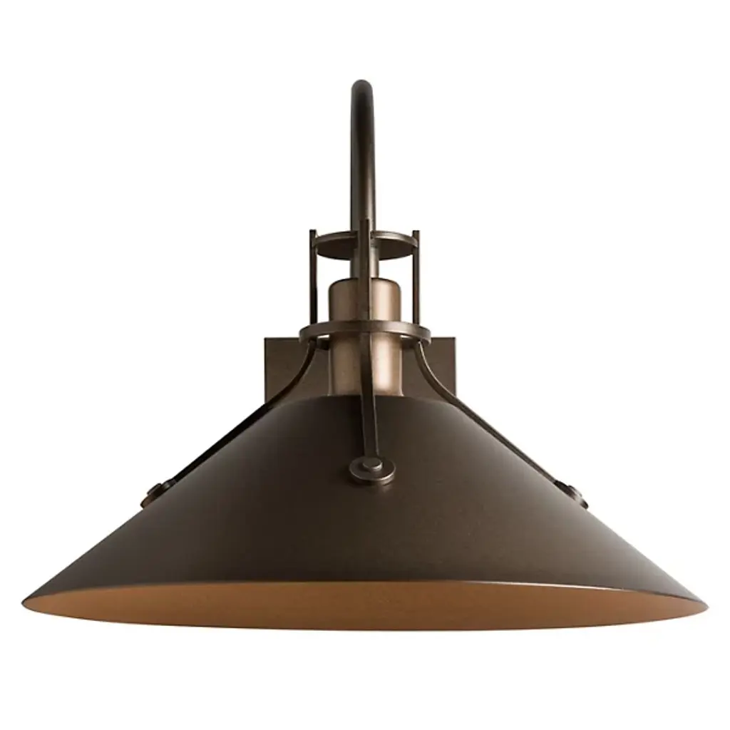 Adorn exteriors with the striking coastal style of the Henry Outdoor Wall Sconce by Hubbardton Forge. Constructed of aluminum with a unique outdoor finish specifically created to withstand harsh environmental conditions, this robust fixture brightens outdoor areas with an ample wash of warm light that beams from under a cone-shaped shade. A sharp, squared backplate supports the fixture, while a smooth gooseneck arm extends to suspend the wide shade. This fixture features a double shade to ensure uplight is blocked, offering a Dark Sky compliant lighting solution.