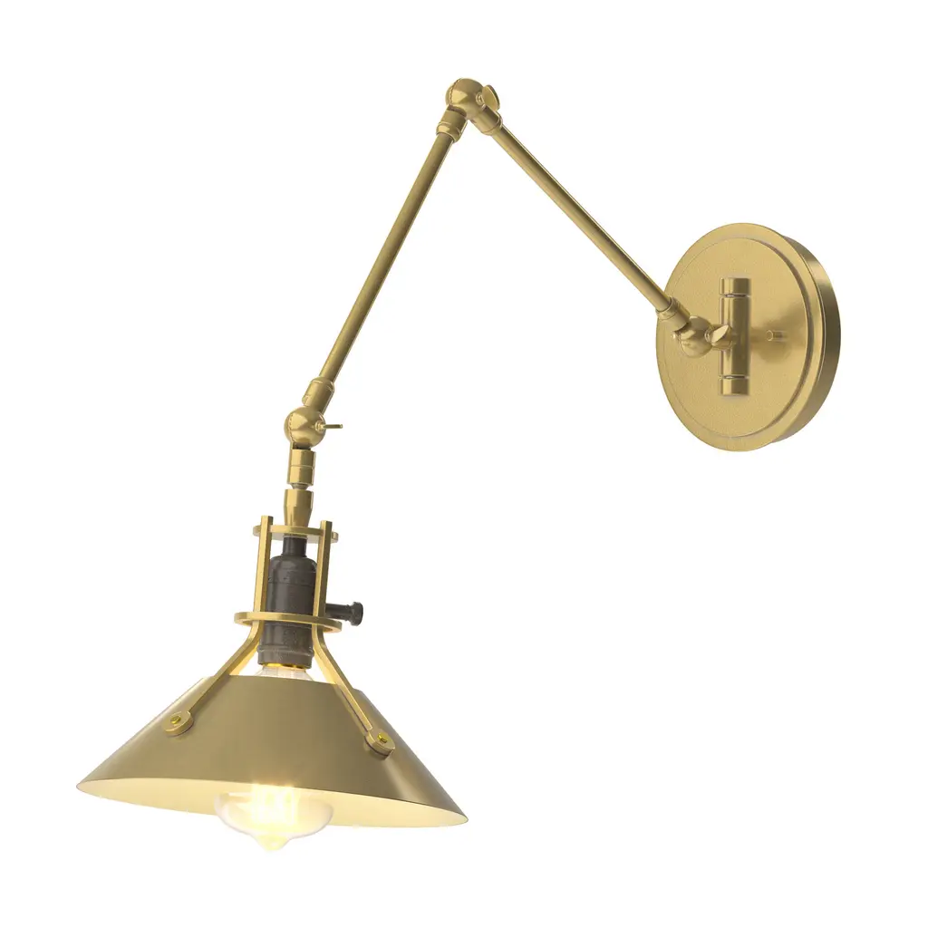 The Hubbardton Forge Henry Wall Sconce is for the consumer who appreciates the shapes and forms in contemporary design, but still wants to maintain traditional character in their lighting options. A round backplate supports an adjustable arm that is completed to a simple shade. A metal cage attaches the shade to the adjustable arm, adding a small amount of industrial aesthetic.