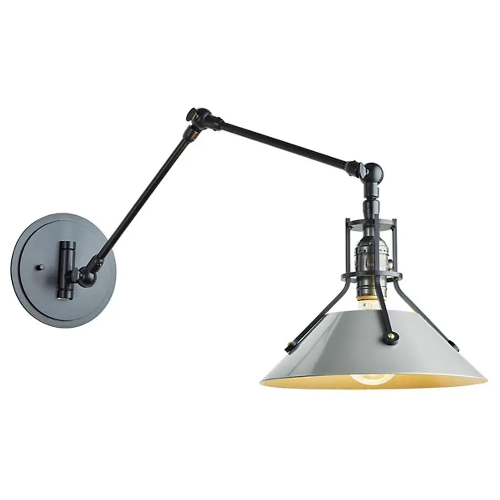 The Hubbardton Forge Henry Wall Sconce is for the consumer who appreciates the shapes and forms in contemporary design, but still wants to maintain traditional character in their lighting options. A round backplate supports an adjustable arm that is completed to a simple shade. A metal cage attaches the shade to the adjustable arm, adding a small amount of industrial aesthetic.