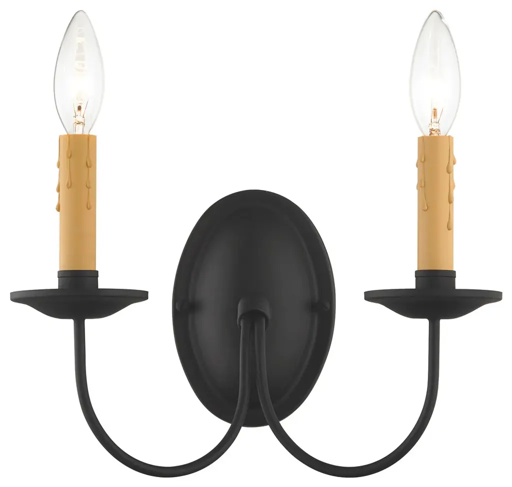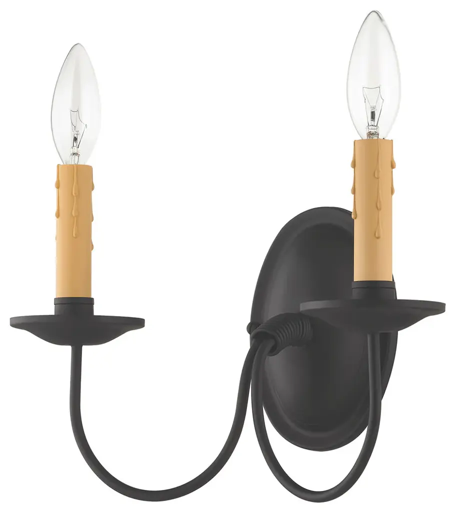 The clean design of this steel construction two light wall sconce is enhanced with a black finish. The sweeping arms create a slim silhouette from which the candelabra bulbs emit their soft, romantic glow. Its informal, transitional beauty works well with many room decor schemes.Finish: BlackMaterial: SteelNumber of Bulbs: 2Bulb Base Type: Candelabra BaseMax Wattage: 60Backplate Size: 4"W x 6"HExtension: 6.5"Suitable for Dry Locations? YesSuitable for Damp Locations? NoSuitable for Wet Locations? NoADA Compliant? No
