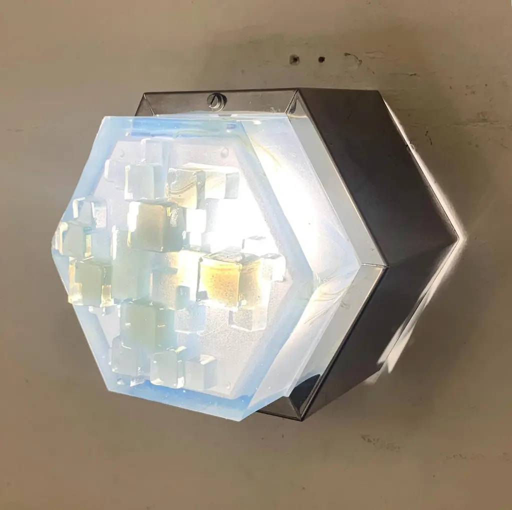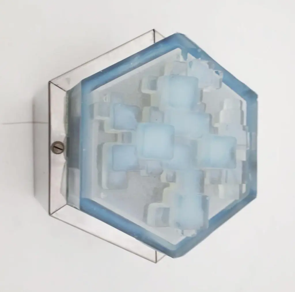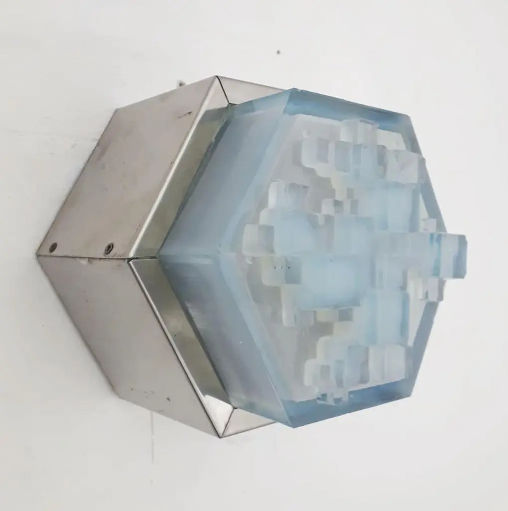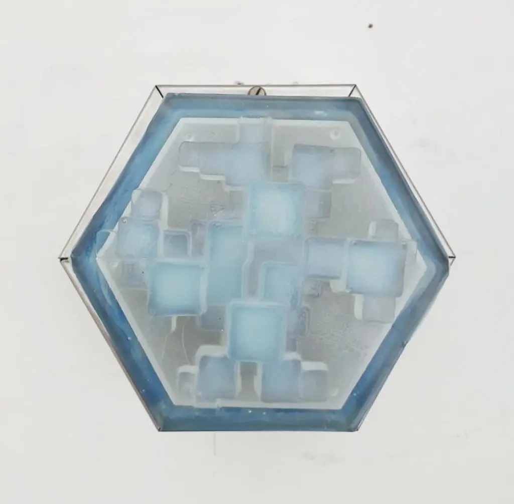 Vintage original midcentury wall light or flush mount with hexagonal steel frame and hexagonal light blue frosted glass diffuser by Poliarte / Made in Italy, circa 1960s1 lights / E14 type / max 40WSize: Diameter 7 inches, height 5.5 inches3 available in stock in Italy, price listed is for each itemOrder reference #: FABIOLTD W601
