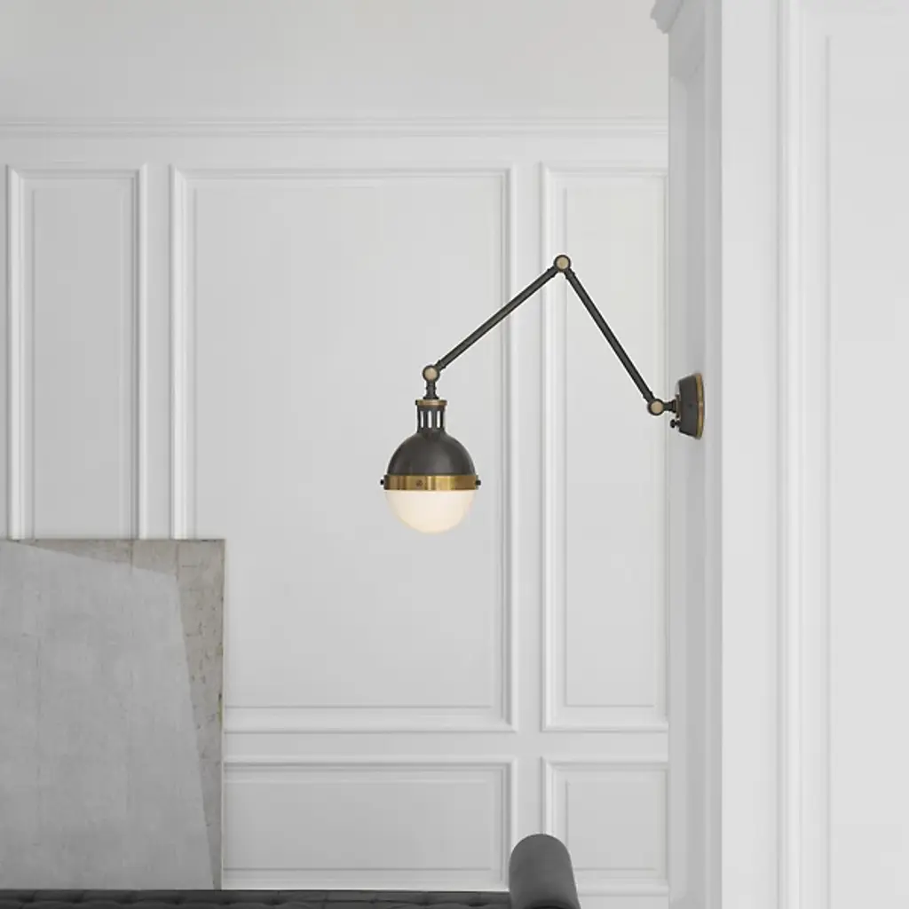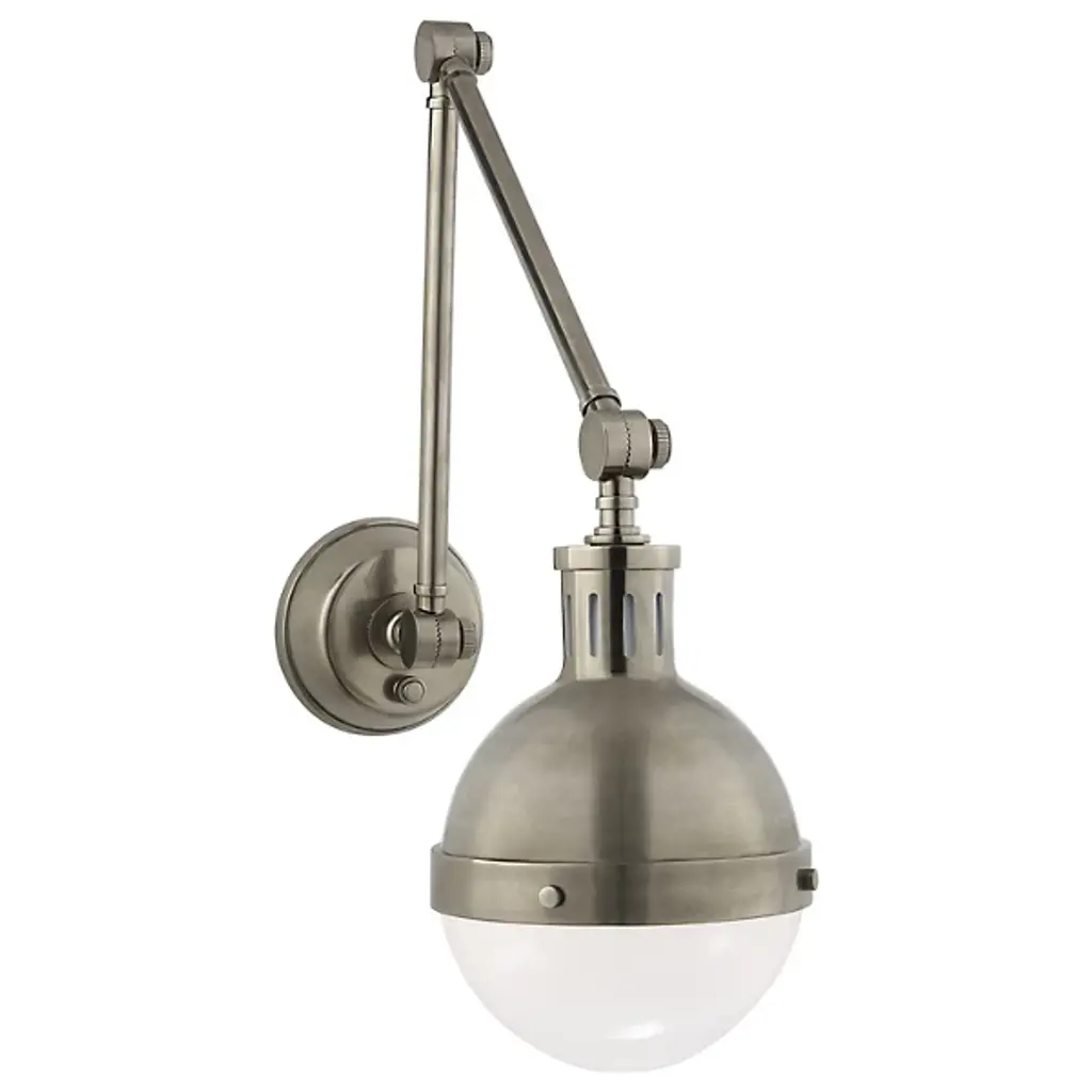 Superior illumination and versatility. The Hicks Adjustable Wall Sconce by Visual Comfort Signature, formerly known as Visual Comfort, is a sleek and stylish answer to boosting the form and function of your home or office. Its white glass shade allows for a strong yet comforting level of light that's ideal for working on late-night projects or reading before bedtime. This sconce also features a movable arm, making for easy maneuvering to brighten any area of a bedside or desk.