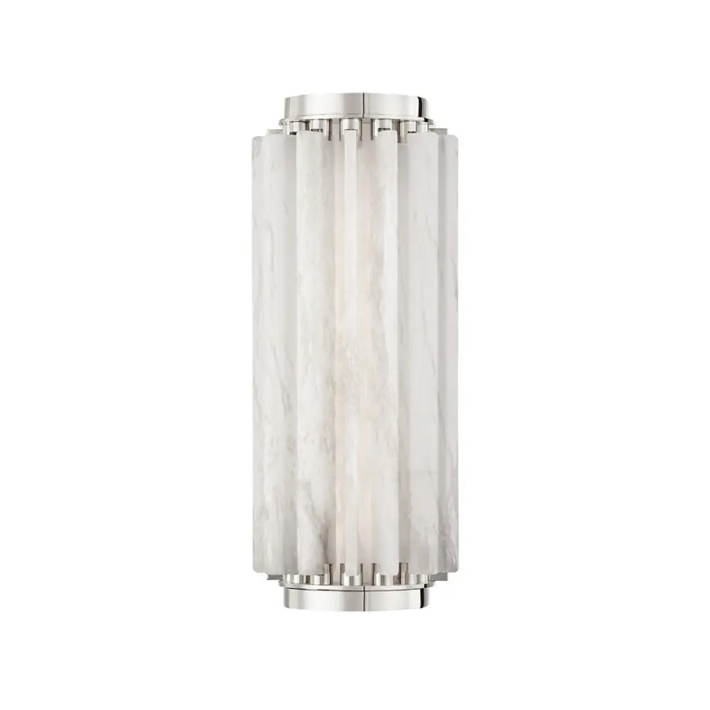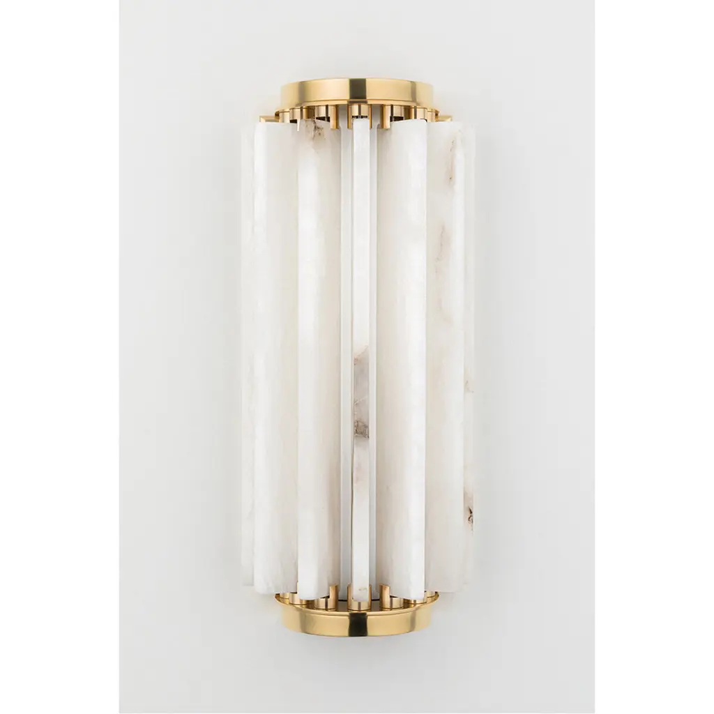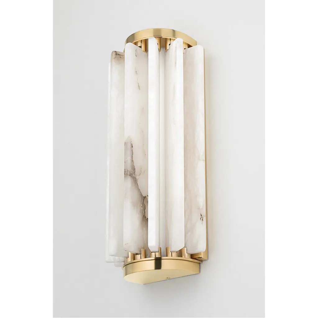 Individual fins of Spanish alabaster flow in and out of a metal backplate giving this stunning sconce a wavelike feel. An opal matte glass tube at the center holds an LED bulb that fills the white alabaster diffuser with a soft, soothing light. This sconce comes in two sizes and the backplate is available in three finishes: Aged Brass, Old Bronze and Polished Nickel.