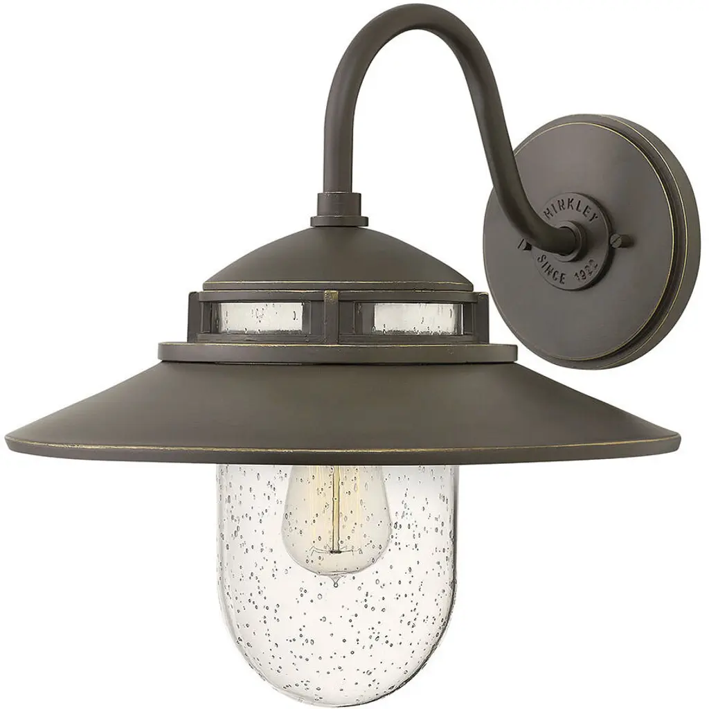 A vintage silhouette brings undeniable charm and character to this large industrial outdoor wall light. Perfect for a porch or patio, the light features an aged zinc finish over aluminum construction. A clear seedy glass shade is a perfect finishing touch. From the Atwell collection by Hinkley.
