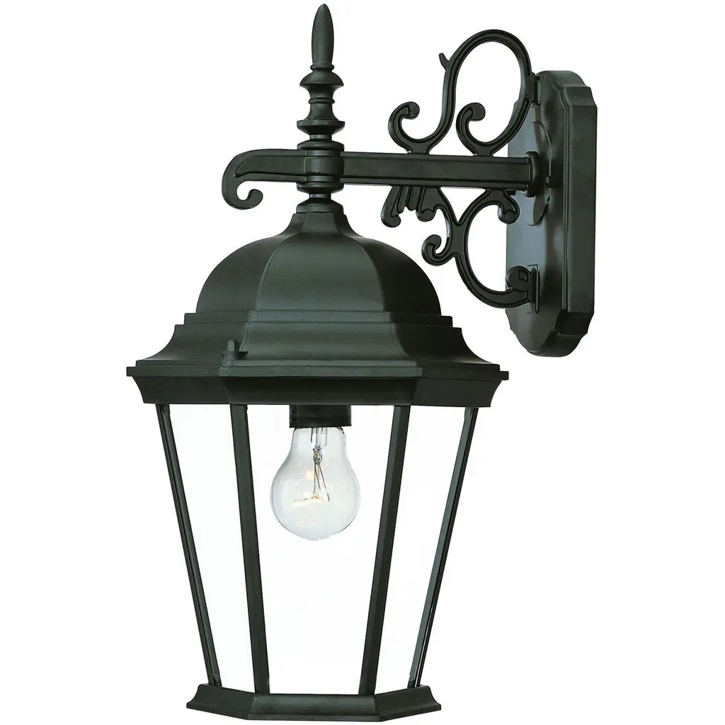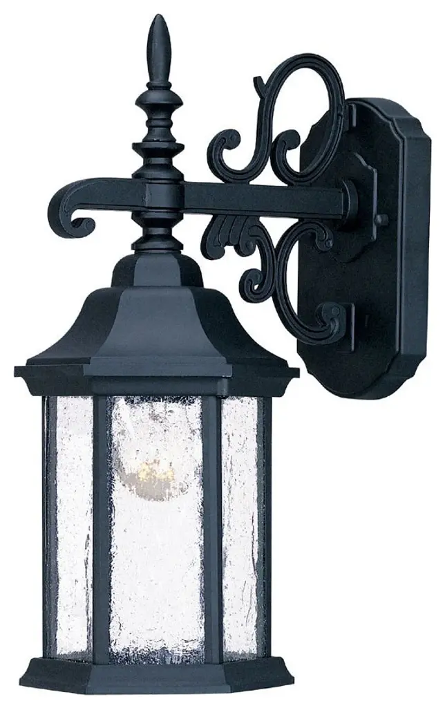 Traditional flourishes decorate the sophisticated Edgewater Collection of lighting. Slender candelabra fixtures glow within this lantern-style design. This outdoor wall light features a black finish and clear seedy glass. From Hinkley's outdoor lighting collection.