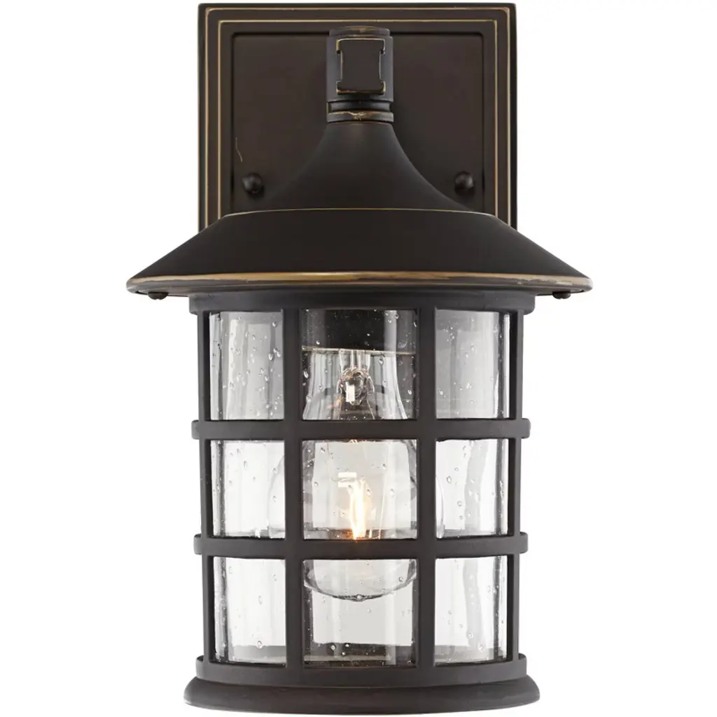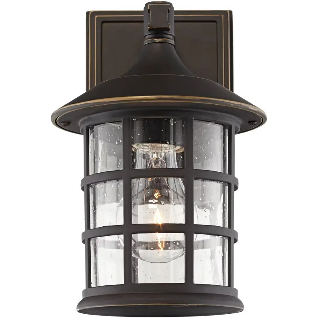Inspired by traditional design, this cast aluminum outdoor wall light boasts clean lines and a matte black finish. Clear seedy glass adds a decorative touch to the grid style housing. A rectangular back plate and straight arm hold the fixture to the wall. From the Hinkley Lighting Freeport Collection.