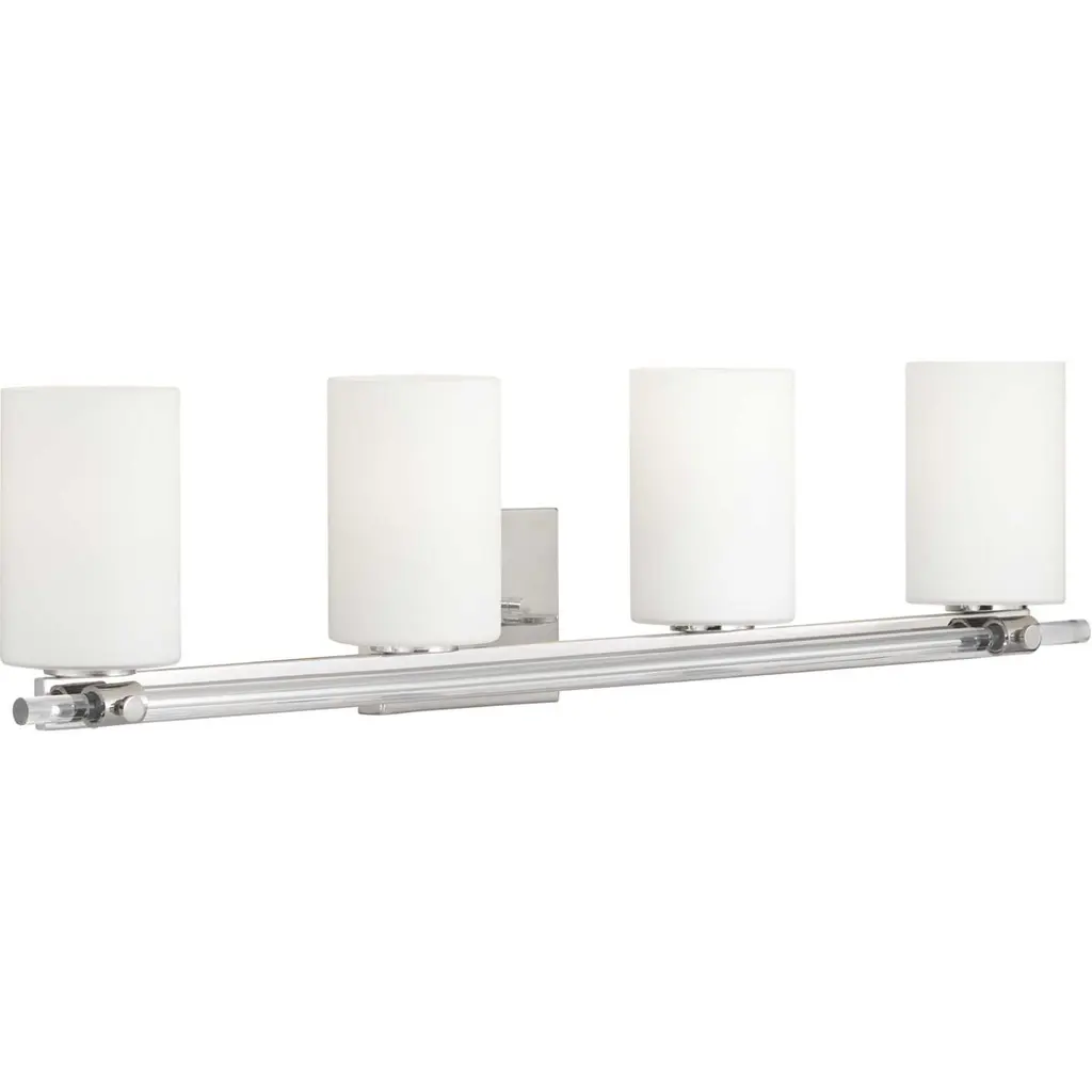 Bold, but minimalist in the same moment, this contemporary four-light bath light lends a refined, composed look to any room in the home. A stylish addition, the bath light is complemented with a brushed nickel finish. Its cylindrical shade boasts etched opal glass for beautifully diffused illumination. Subtle curves perfectly complement this creation from the Kyra collection by Hinkley.