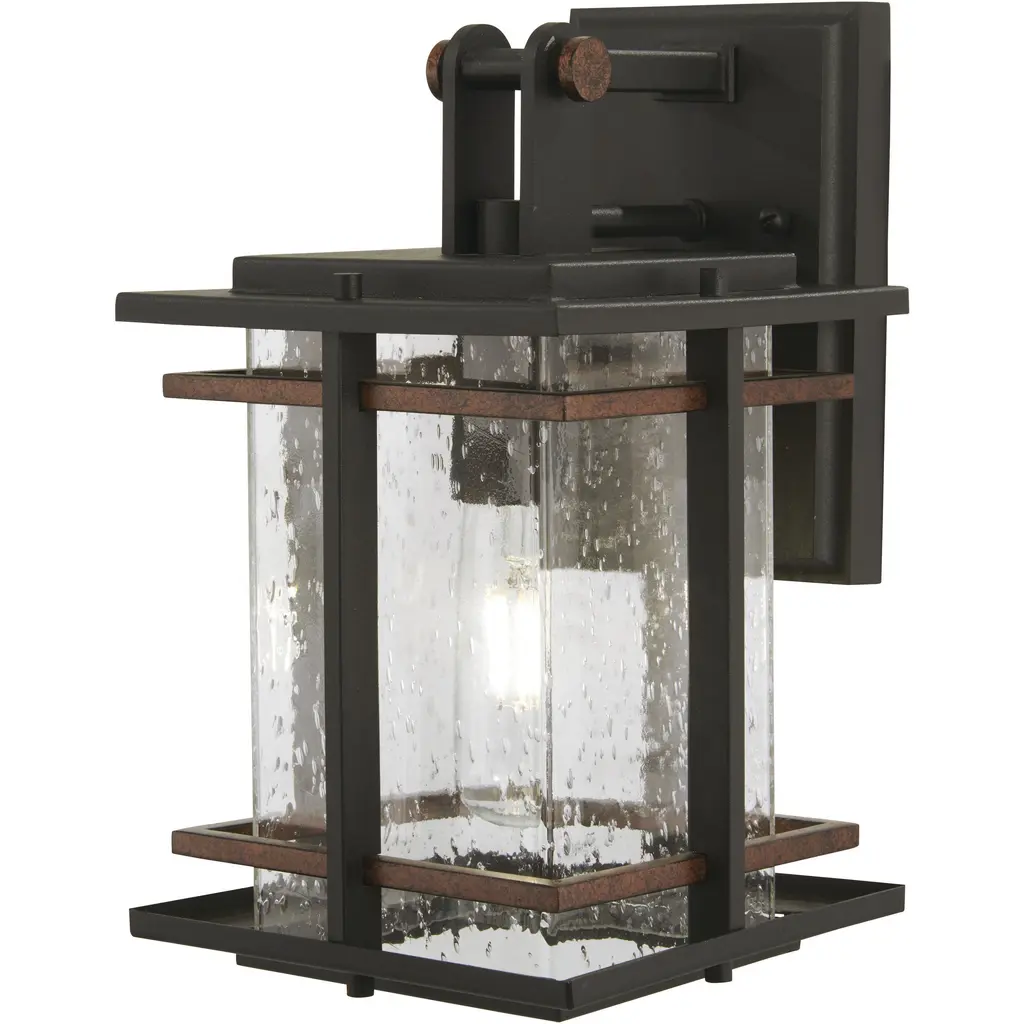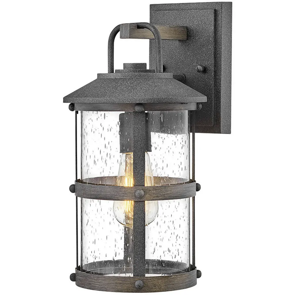 The Lakehouse rustic outdoor wall light features a distressed, Aged Zinc with Driftwood Gray and Black finish accompanied by clear seedy glass. Cast aluminum construction ensures Lakehouse will withstand for years. An elegant look with eye-catching details, ideal for porch lighting and patio applications.