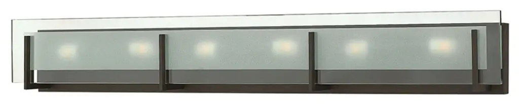 Six Light Bath from Latitude collection in Oil Rubbed Bronze finish. Number of Bulbs 6. Max Wattage 60.00 . No bulbs included. Latitude is contemporary and sleek, finding its true beauty in the minimalist design. The slim glass panel features rectangular etching while the subtle frames add understated architectural style. No UL Availability at this time.
