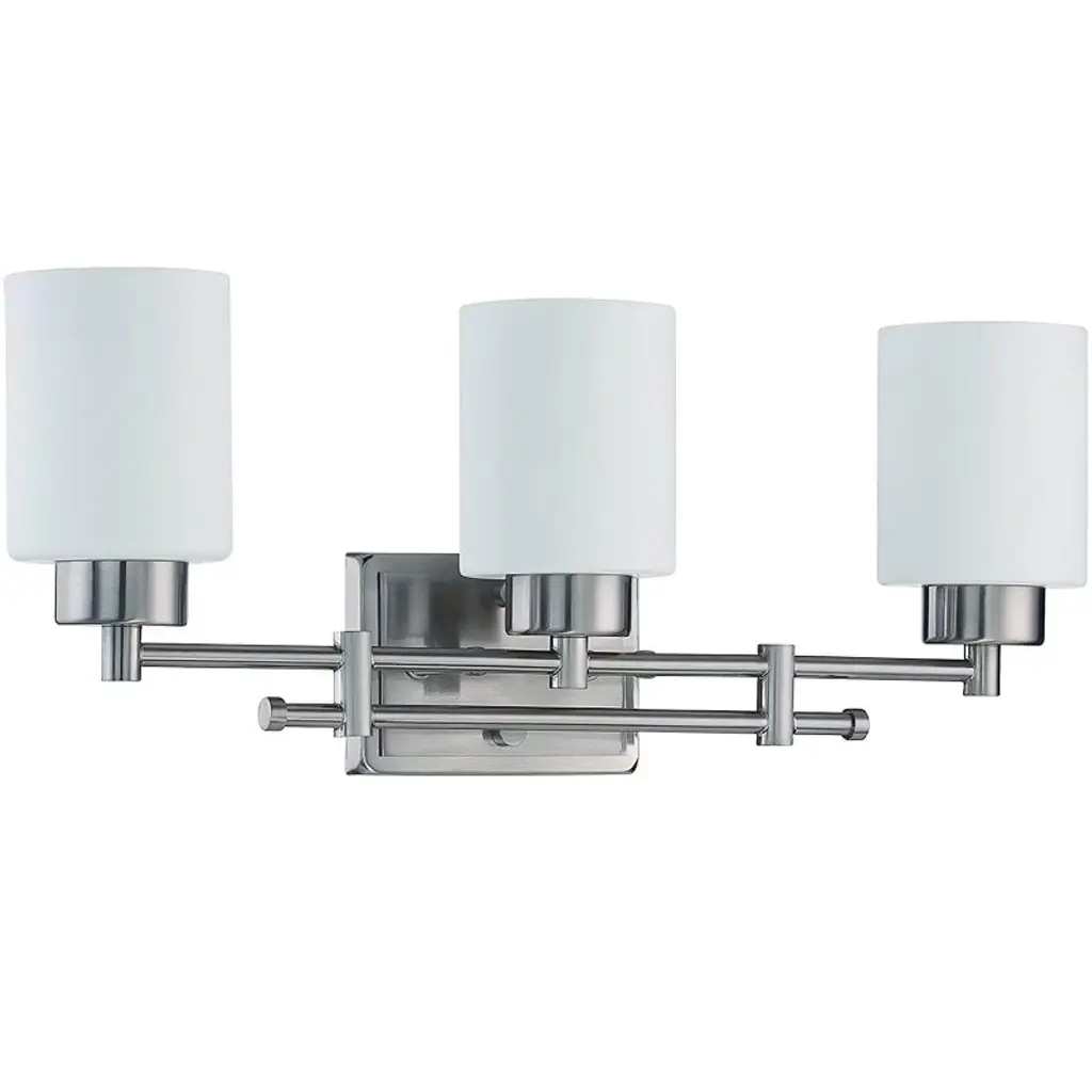 A cast metal, stepped back plate and die-cast metal crosses convey the elegance of this transitional, three-light brushed nickel bath fixture. Cylinders of etched opal glass highlight each wonderful detail with a soft glow from the light each surrounds. A sophisticated design for your bath, from Hinkley.