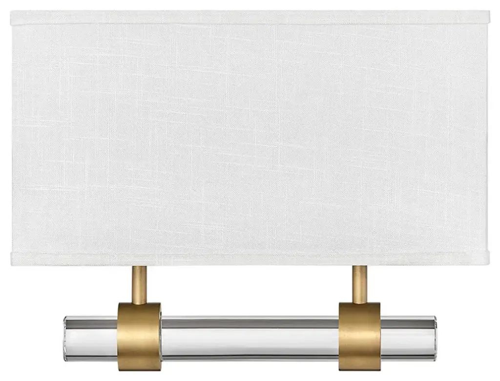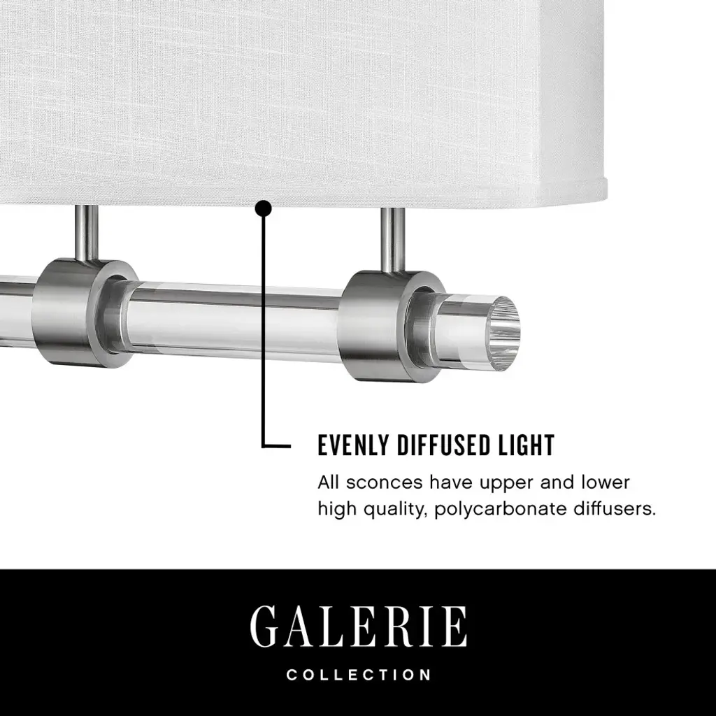 Inspired by its lustrous appeal, Luster is a supremely suitable wall sconce for a variety of hospitality or residential settings. Luster features a clear glass rod with chic beveled ends, and comes in either a Brushed Nickel or Heritage Brass finish met with an Off White Linen or Heather Gray Linen shade. This LED sconce is fully dimmable and ADA compliant.Bulb(s) Included: YesSuitable for use in dry (indoor) locations as defined by NEC and CEC. Meets United States UL Underwriters Laboratories & CSA Canadian Standards Association Product Safety Standards Merging modern and classic elements, the Galerie collection offers a selection of LED ceiling and sconce fixtures with unique details that effortlessly balance a variety of spaces with form and function. The complementary contours, materials and finishes allow each silhouette to be used in unison or easily combined with other Galerie pieces. Classic gleaming light brass finish LED components carry a 5-year limited warranty Meets California Energy Commission 2013 & 2016 Title regulations/JA8 Diffusers are made of high transmittance, high diffusion, color stable LDA-filled polycarbonate to maximize delivered lumens. Fixture is ADA compliant and adheres to the standards and guidelines listed by the Americans with Disabilities Act Classic, elegant lines and timeless details enhance a traditional space Mounting hardware is hidden on the backplate to ensure a clean silhouette Fixture mounting plate supports both junction box and direct wire install of either Romex or Condult.