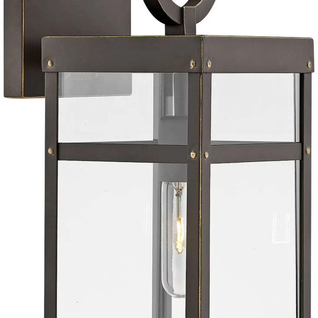 Embrace the romance of industrial farmhouse design with this eye-catching medium outdoor wall light by Hinkley. Clear glass panels combine to create the geometric shade the sits atop the aluminum frame. In an oil-rubbed bronze finish, the charming silhouette is topped with an open circle that adds depth.