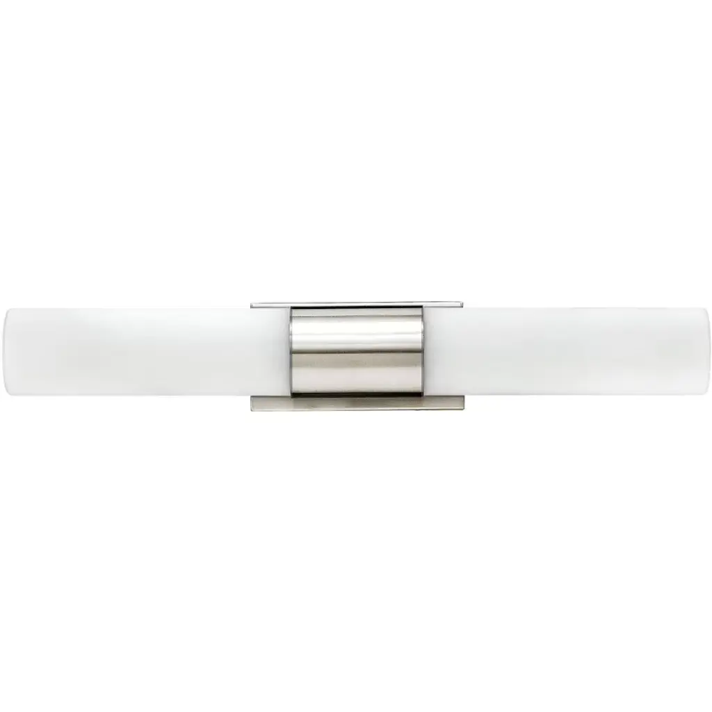 A pair of blown etched opal glass cylinders provide a uniform glow from the light source in this energy-efficient LED bath light. With a polished nickel finish center piece, this sleek, contemporary light can be dimmed with any standard dimmer. Transform your bath with this sophisticated design from Hinkley.
