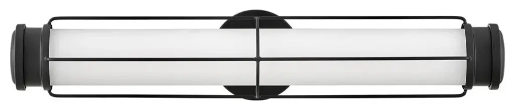 Designed by Hinkley, this dimmable, energy-efficient bath light boasts a long, expanded nautical-inspired cage style frame with slim steel cross bars and dual caps at each end in a bold black finish. An etched opal glass shade in a tubular design rests inside, giving a chic, ship's bridge-inspired aesthetic. Mount this LED bath light vertical or horizontal for a strikingly minimal accent alongside mirrors and other focal walls.