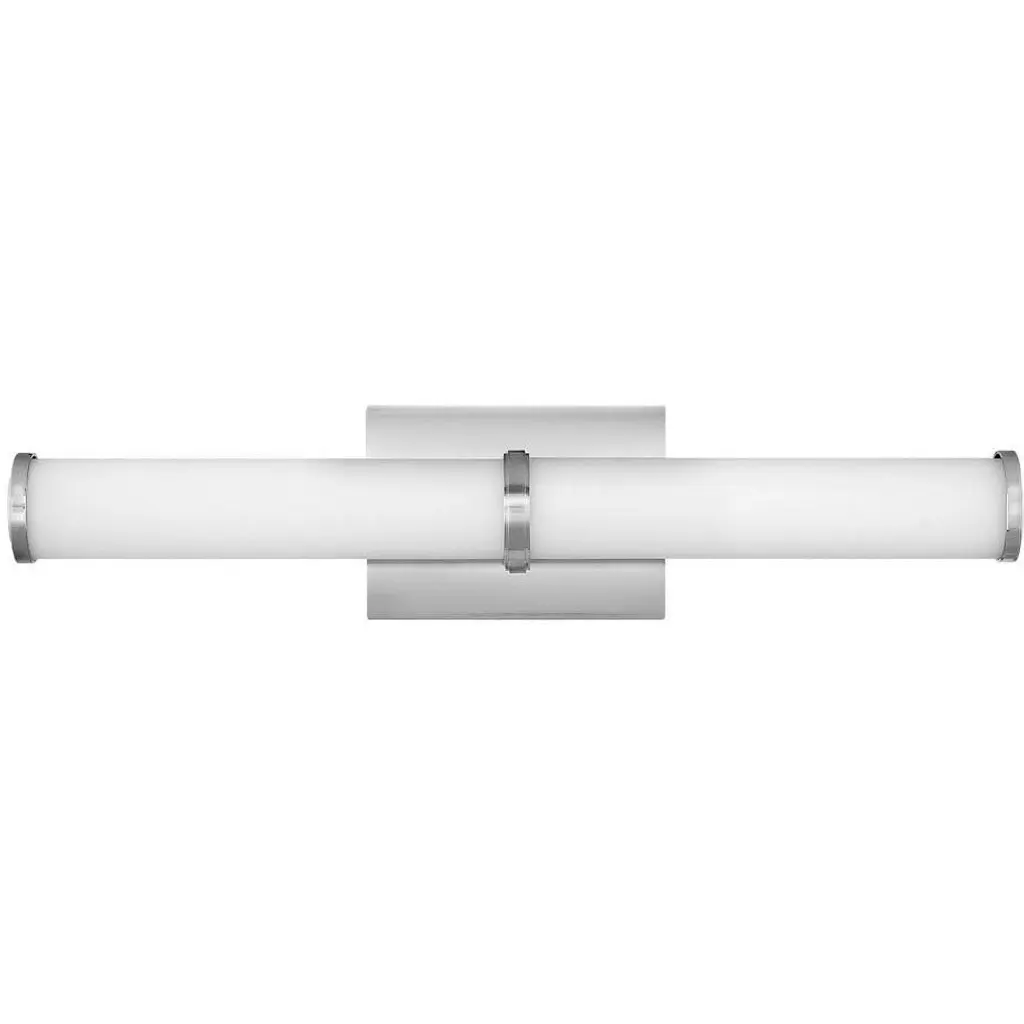 Clean lines and a crisp design profile stand out as elegant simplicity in this Hinkley fixture. With a base mount and frame made from brushed nickel finish steel and an elongated shade in etched white glass, it's sophisticated and stately without overpowering. End caps on its shade offer a slight industrial allure. This contemporary small LED bath light is energy-efficient and ADA compliant.