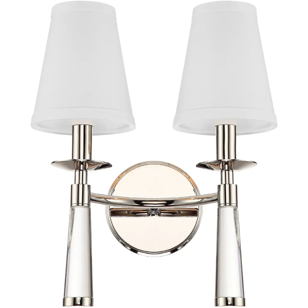 Two Light Wall Sconce from Sussex collection in Brushed Nickel finish. Number of Bulbs 2. Max Wattage 60.00 . No bulbs included. Sussex offers traditional charm with an edge of modern luxury. Offered in Brushed Nickel finish with white fabric hard back shades or English Bronze finish with ivory fabric hard back shades, the glass column and candles add to its sophistication. No UL Availability at this time.