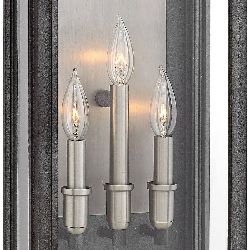 Decorated with an aged zinc finish, this Sutcliffe three-light outdoor wall light by Hinkley is rich and elegant by design. The clear glass accentuates the fine quality of this decorative fixture. The lovely solid aluminum build reinforces the stunning personality of this light.