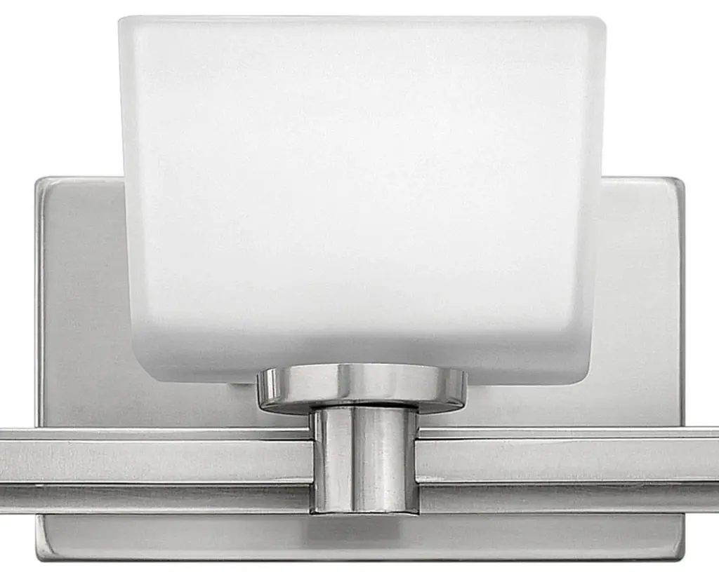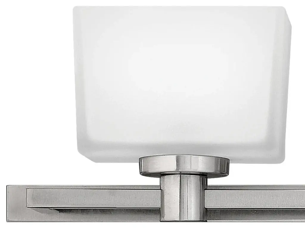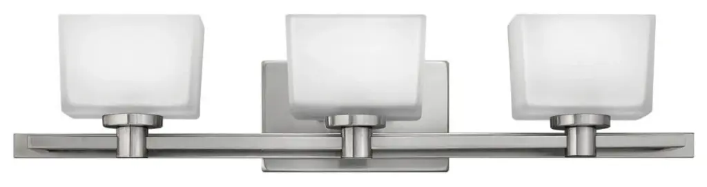 Three Light Bath from Taylor collection in Brushed Nickel finish. Number of Bulbs 3. Max Wattage 60.00 . No bulbs included. Taylors modern silhouette highlights its tapered rectangular etched white glass in either Brushed Nickel, Buckeye Bronze, or Chrome finishes. No UL Availability at this time.