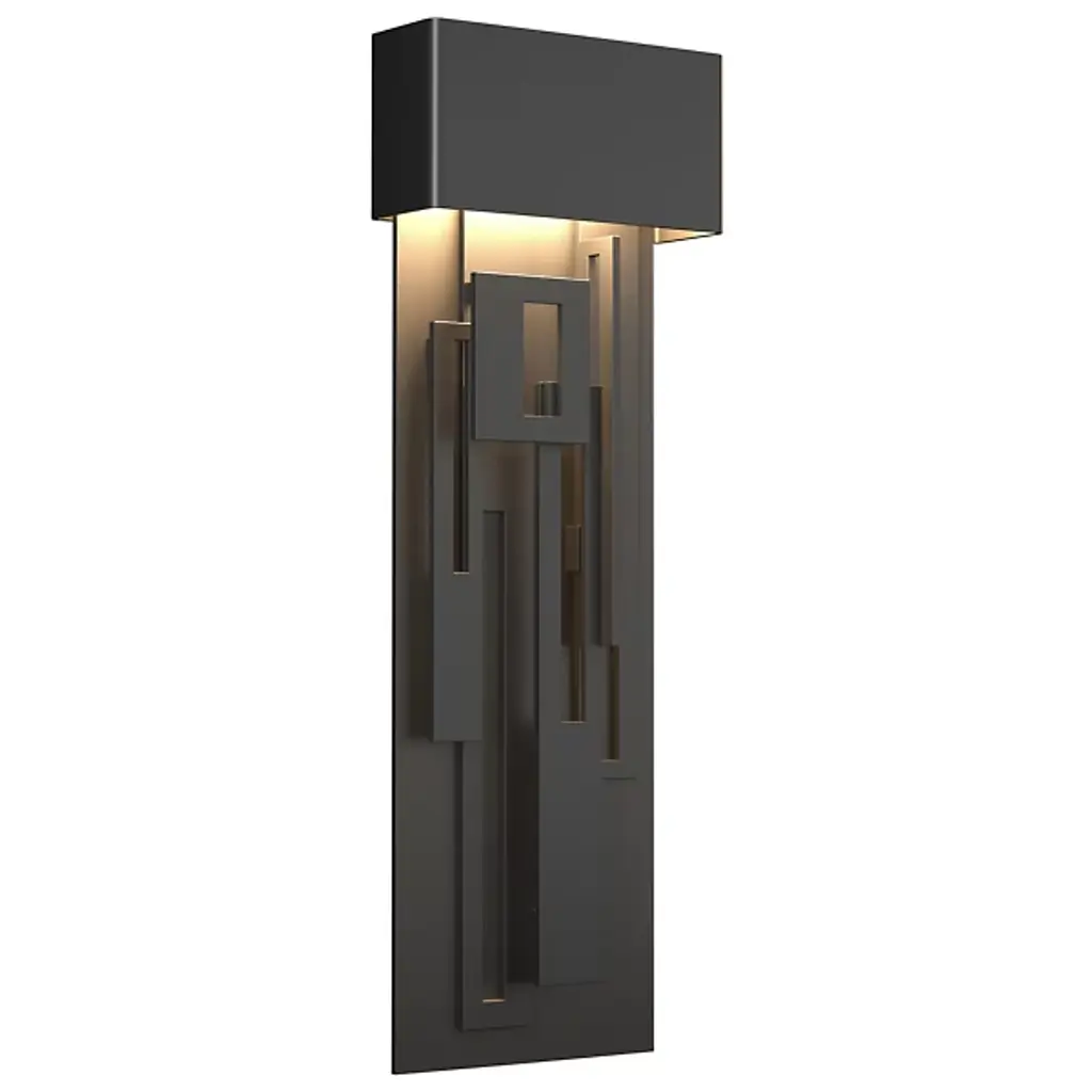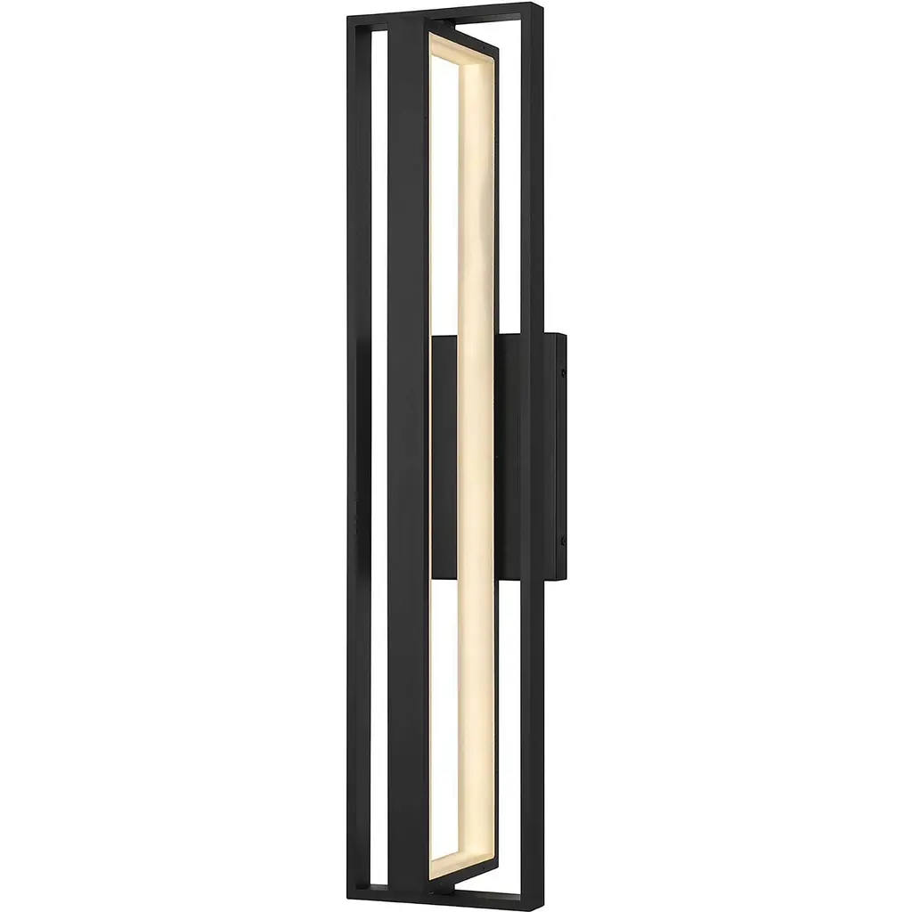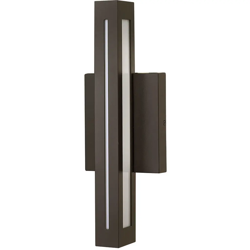 The slender and seamless architectural frame of this tall, modern outdoor wall light is made of extruded and die-cast aluminum finished in bronze. Energy-efficient light from the included LED module is emitted through the white side windows and front sliver window. This ADA compliant fixture is from Hinkley.