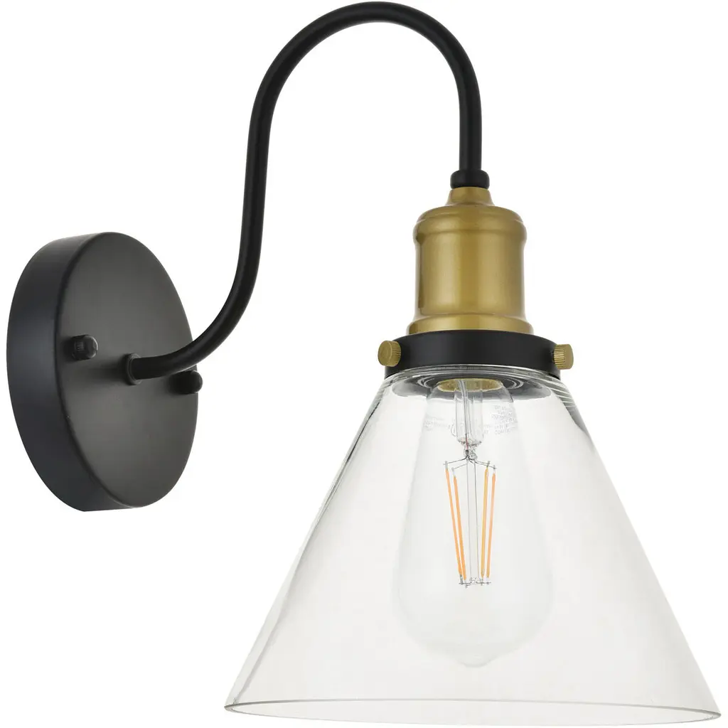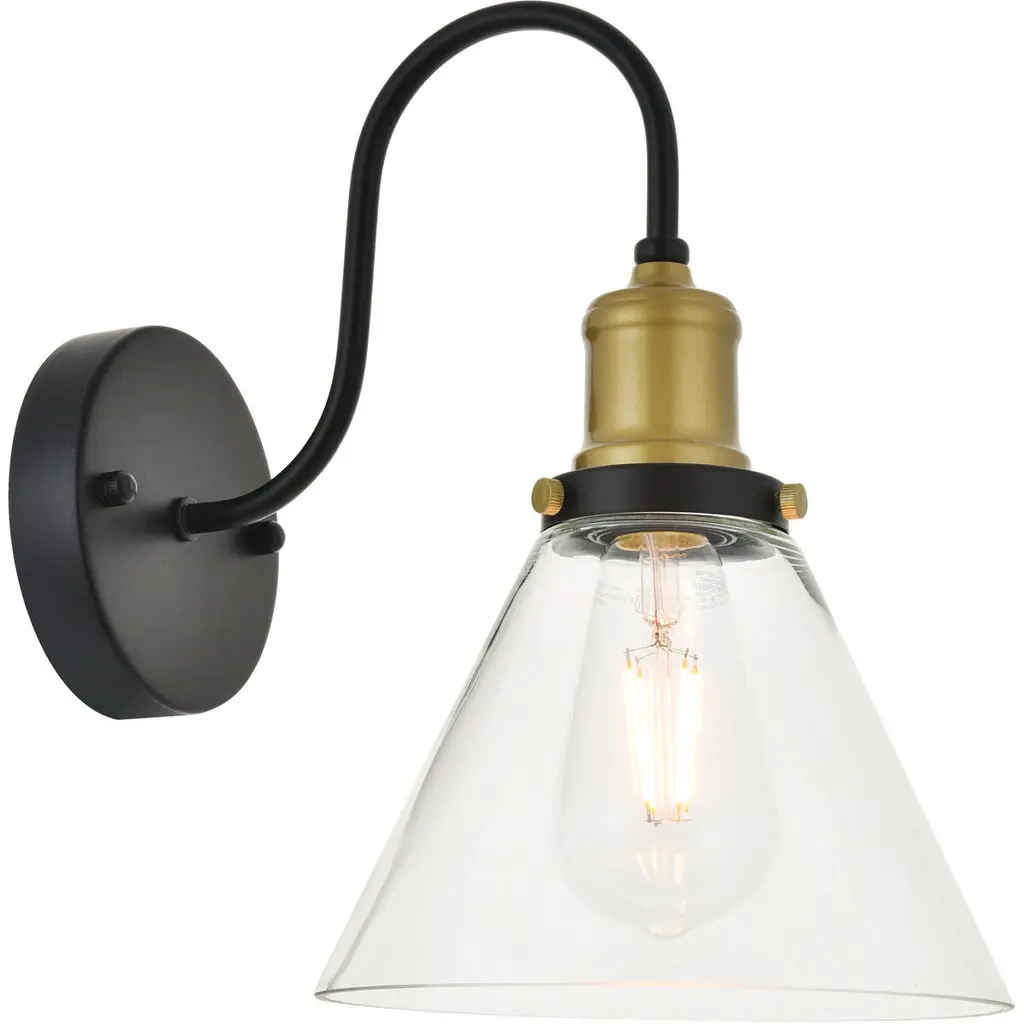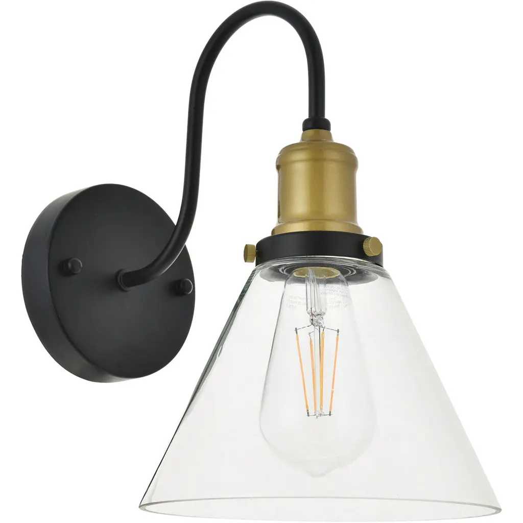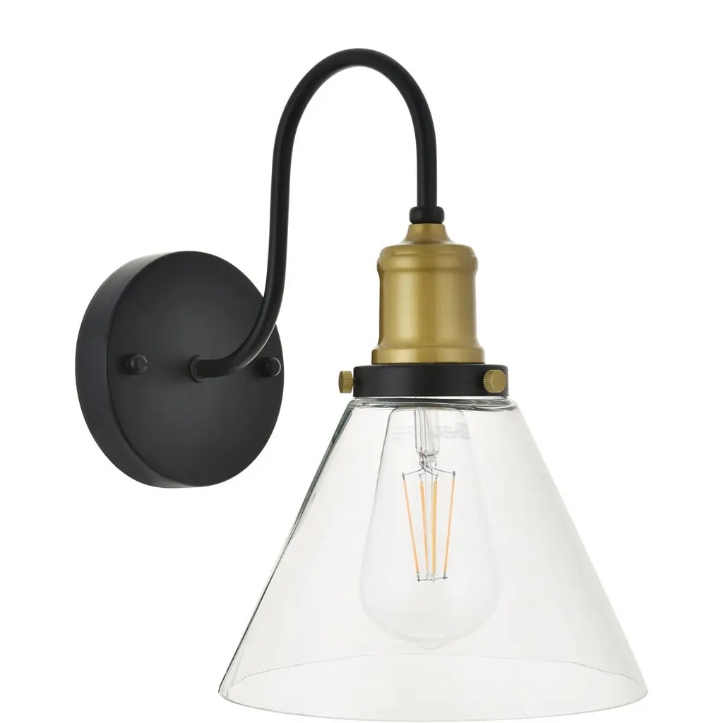 Take a step back through time with the Histoire wall lamp in a brass and black finish. The ever delightful undulating arm supports the clear glass cone shade while light illuminates the surrounding area, creating a beautiful display of charm. A perfect wall lamp to act as your guide in your foyer or living room, or even to light up your bathroom walls, you will always enjoy its captivating light.