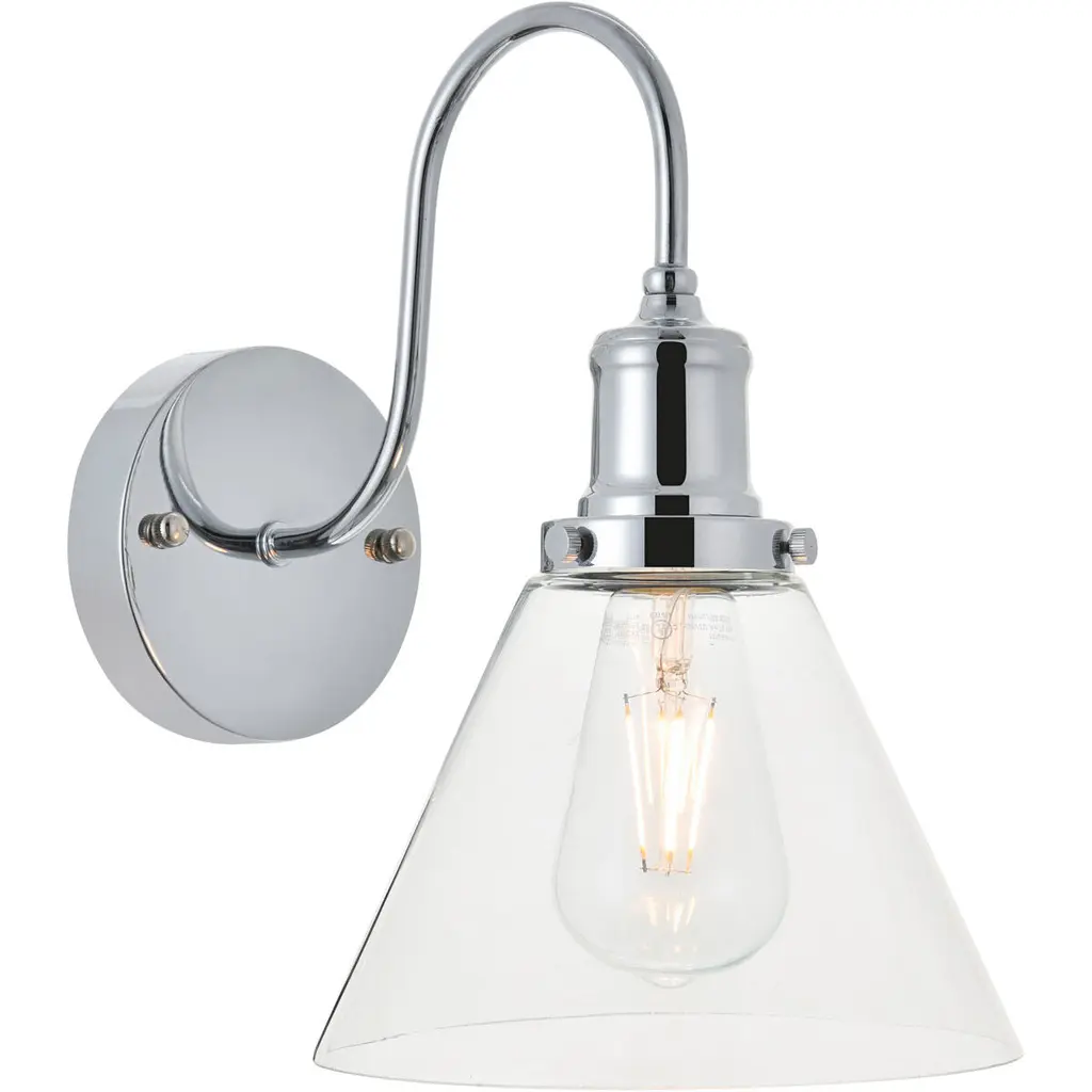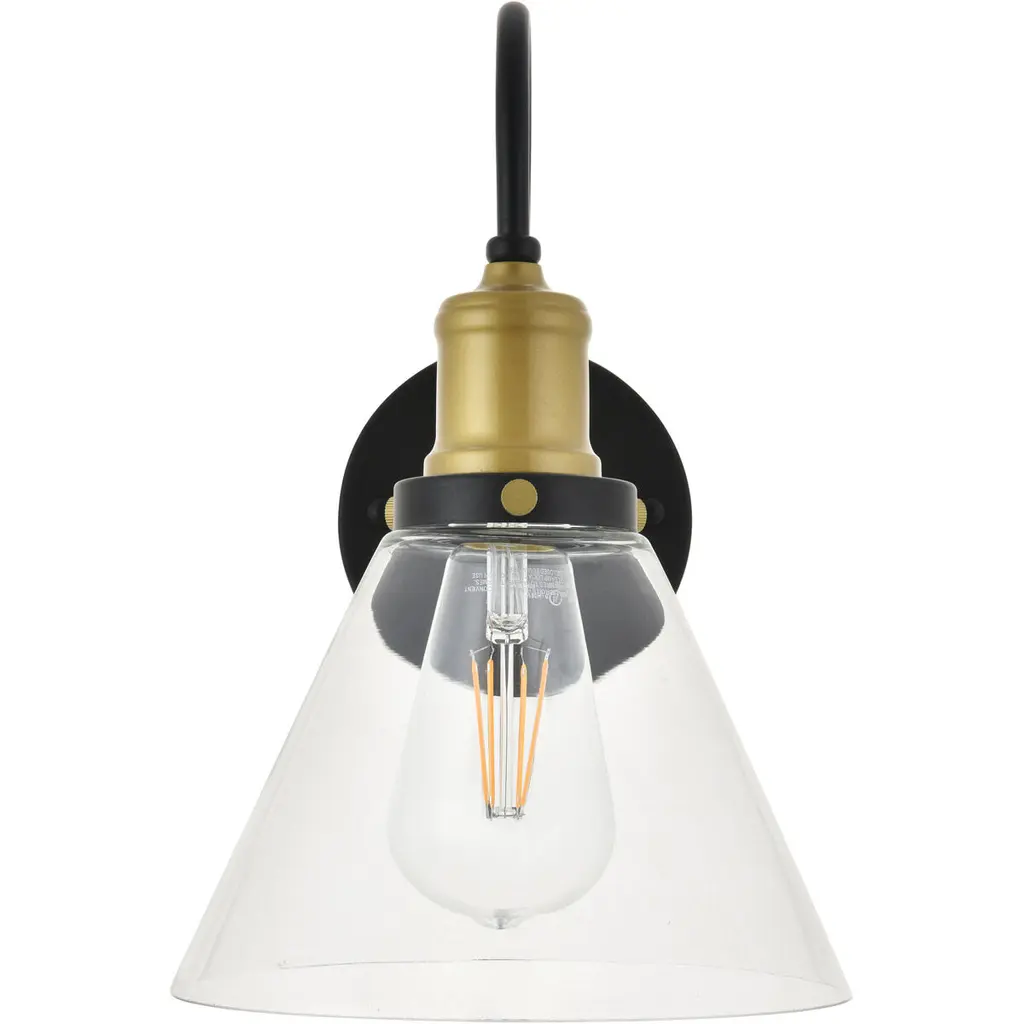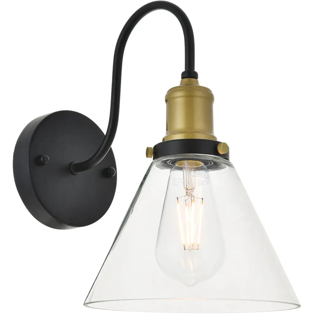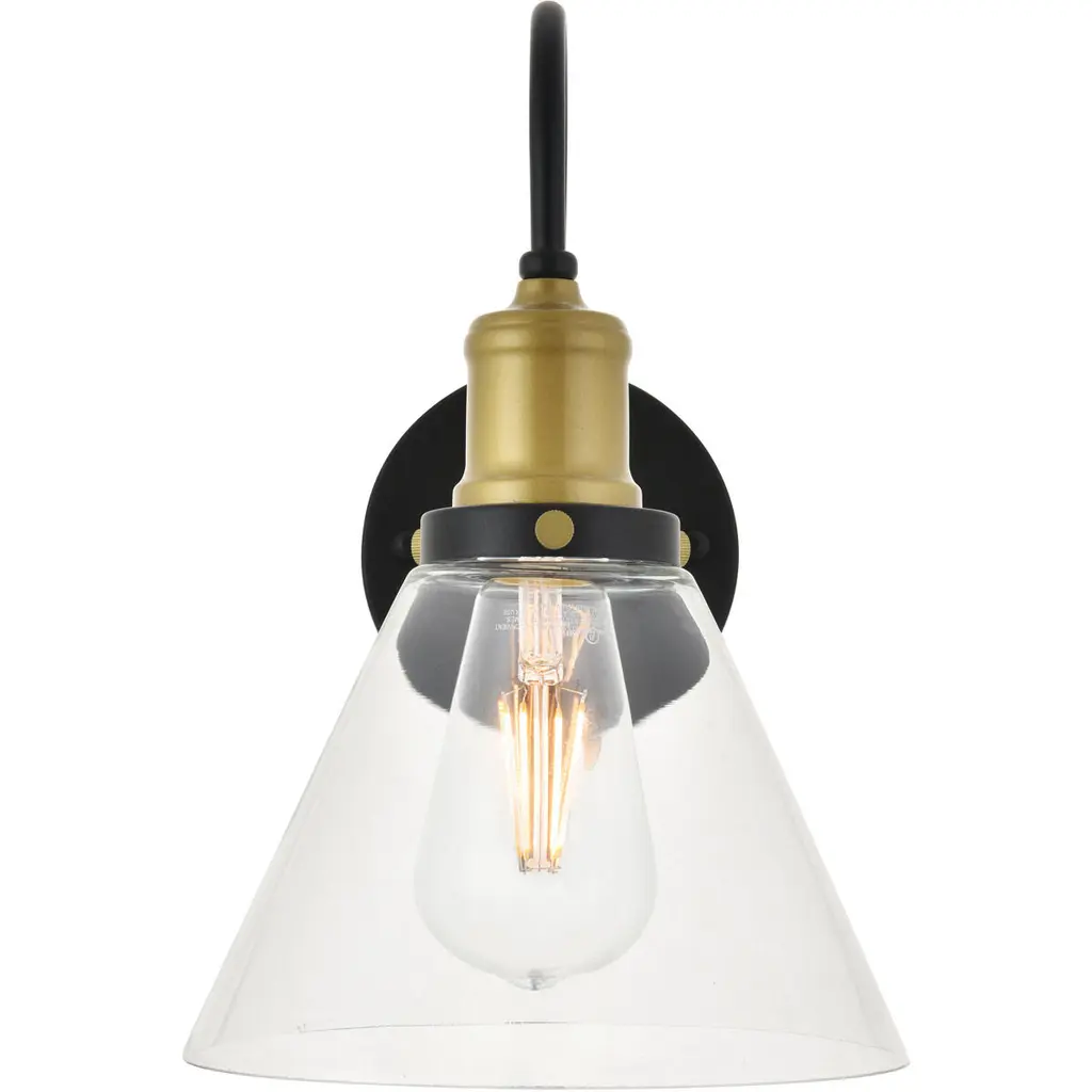 Take a step back through time with the Histoire wall lamp in a brass and black finish. The ever delightful undulating arm supports the clear glass cone shade while light illuminates the surrounding area, creating a beautiful display of charm. A perfect wall lamp to act as your guide in your foyer or living room, or even to light up your bathroom walls, you will always enjoy its captivating light.