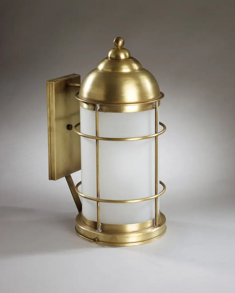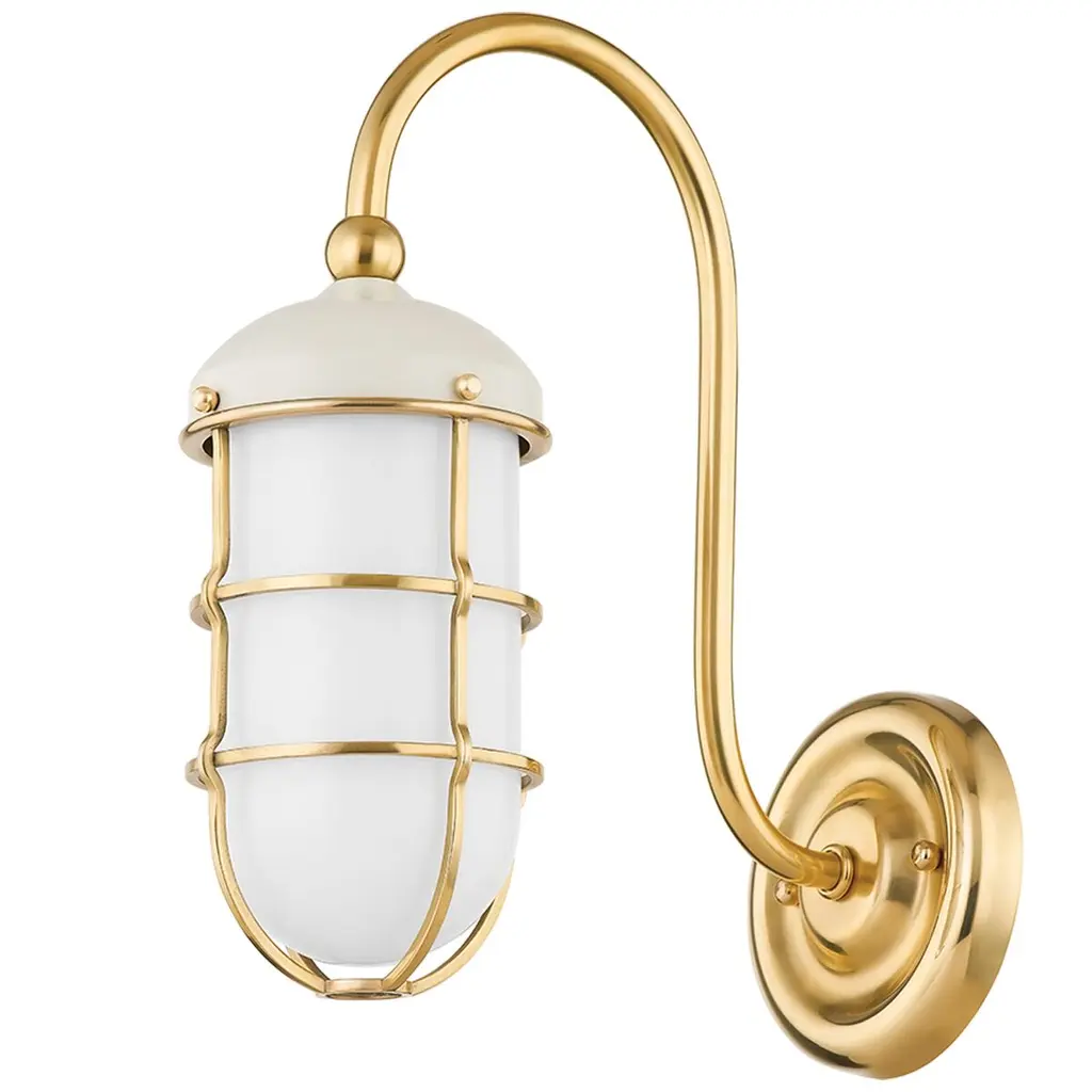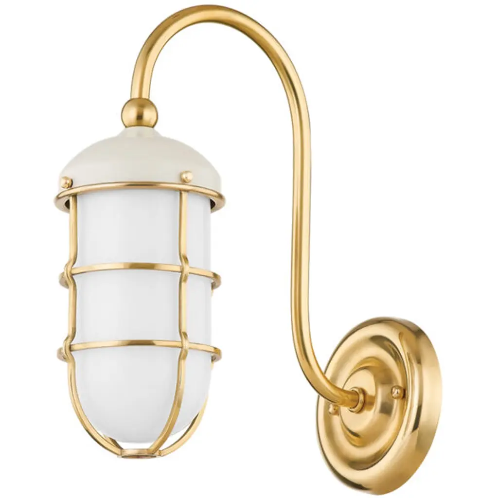 The Holkham Wall Sconce from Hudson Valley Lighting is a stunning lighting fixture that instantly elevates any space. This recognizable silhouette is enhanced by the gorgeous Aged Brass cagework and glossy opal glass, which exudes a refined and sophisticated appeal. The refined hardware contributes to this product's elevated nautical aesthetic. This fixture offers a seamless blend of timeless elegance and coastal-inspired design, making it a remarkable addition to any interior.