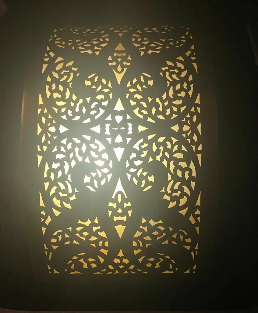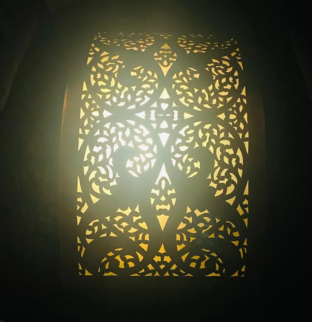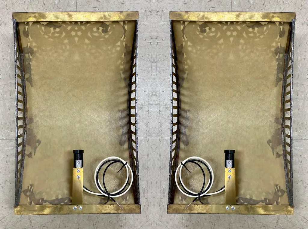 A vintage pair of Hollywood Regency style brass wall sconces. The sconces are finely hand made of high quality brass and feature lovely filigree design. The versatile style of the sconces can complement any home or interior design. The sconces are embellished on the sides with stripe design. The filigree and side design enables the sconces to emit soft light, creating a very cozy and exotic ambiance. The sconces have been recently rewired and each holds 1 candelabra bulb. We have two pairs available.Dimensions: 14" H 8.25" W 3.25" D.