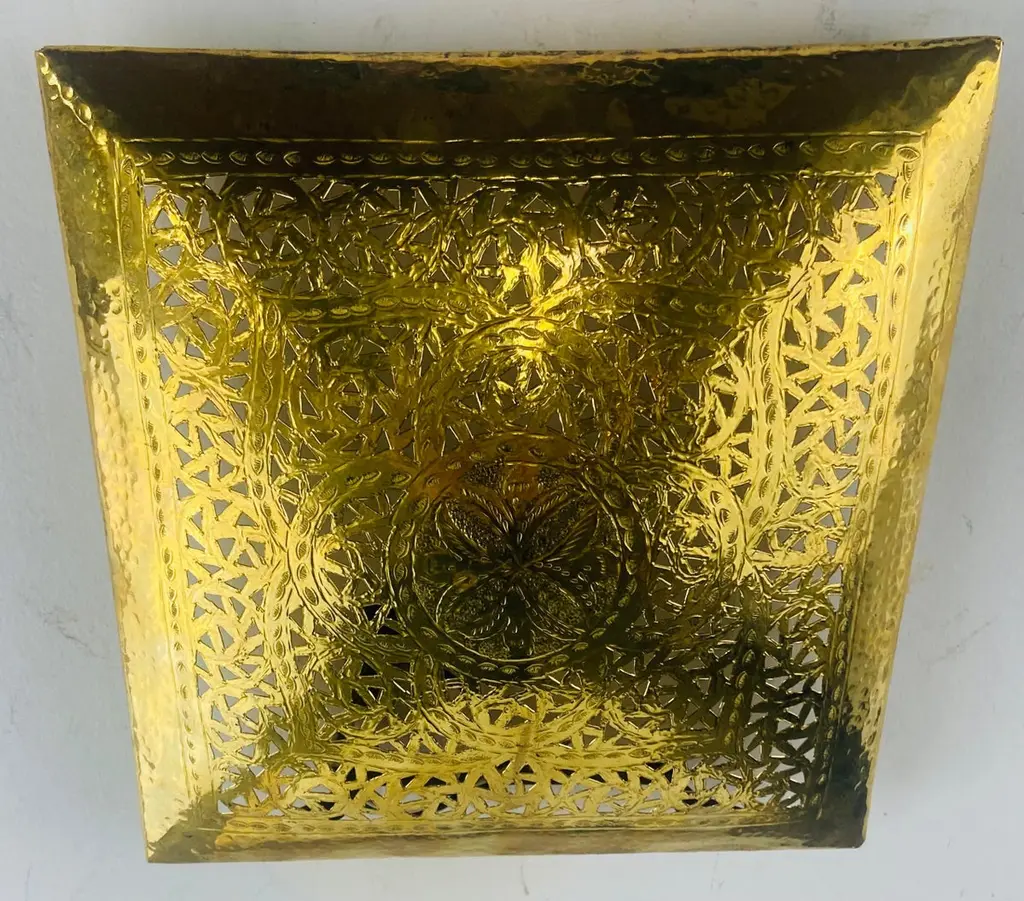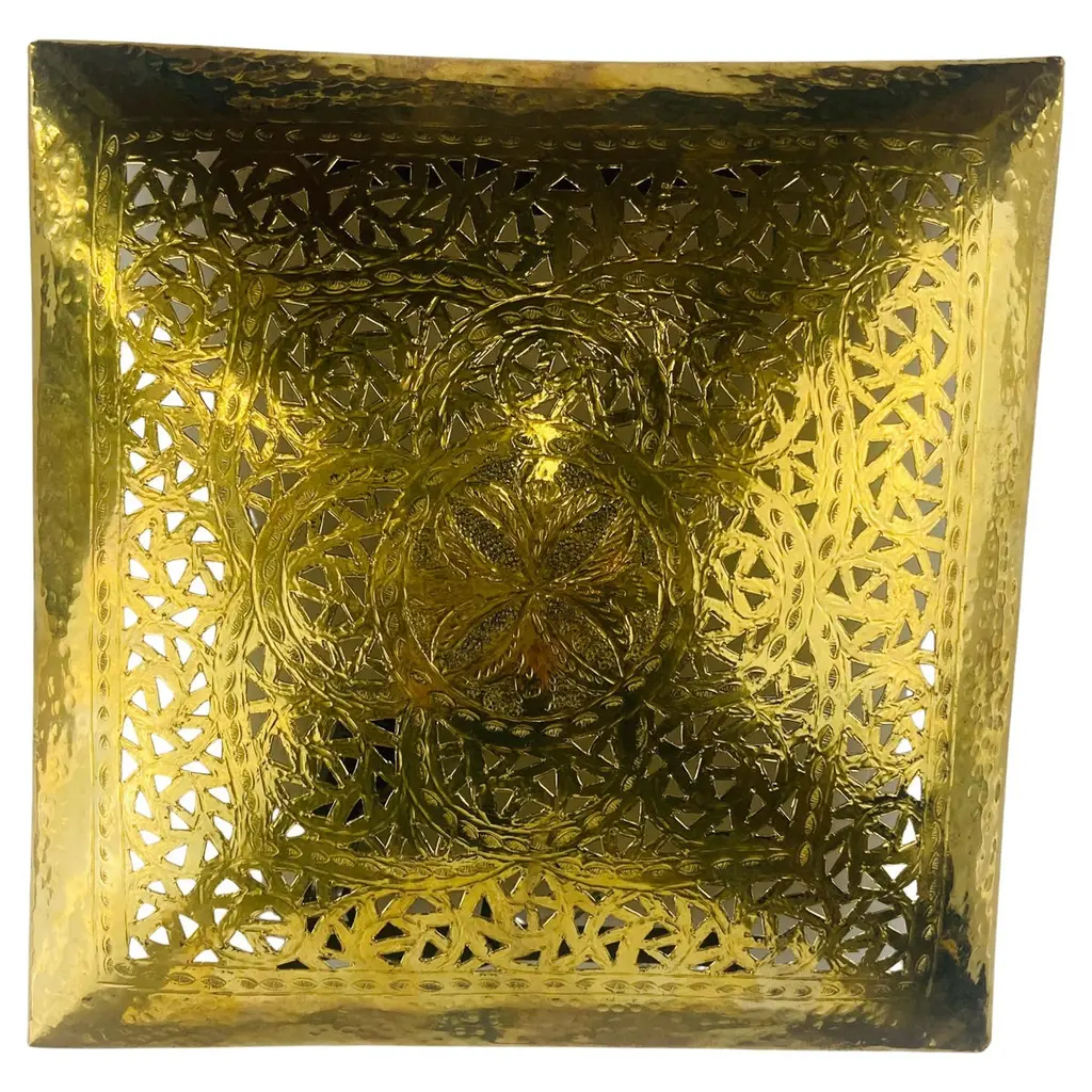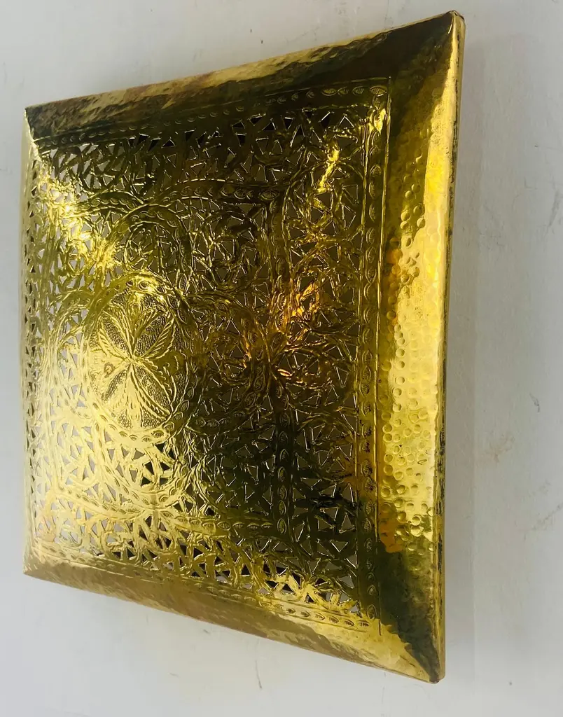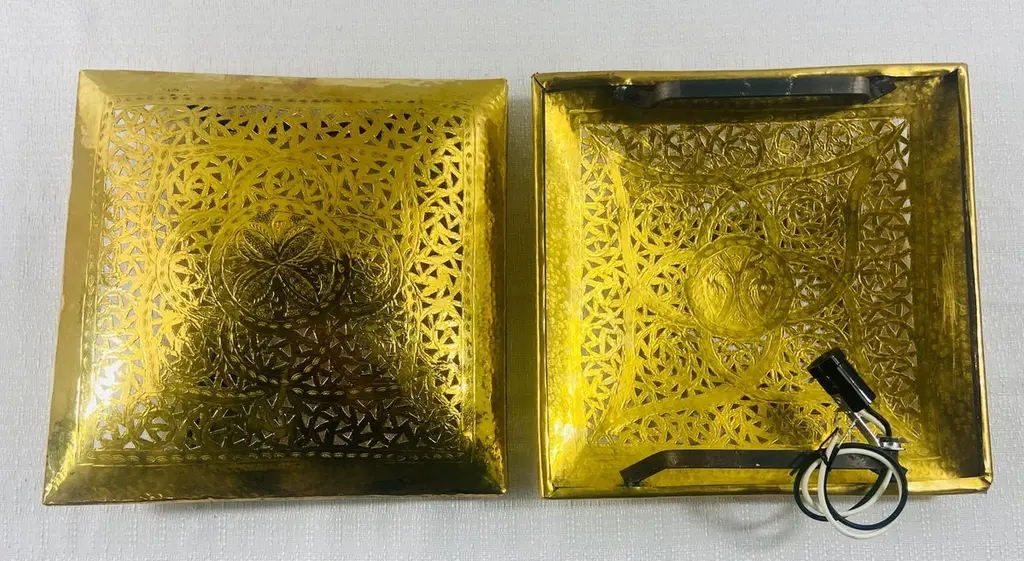 A one of a kind pair of Hollywood Regency style sconces. The stylish pair of sconces is handmade of high quality gold brass and designed in a fine filigree motifs. The square shape of the sconces is desirable and can match and elevate any interior design and style. The sconces have been recently polished as well as wired and are UL listed. The sconces will look wonderful in a foyer, entry hall, or any room. Dimensions: 9.25" by 9.25".