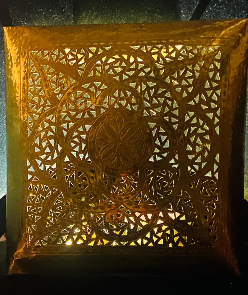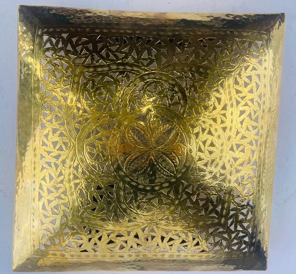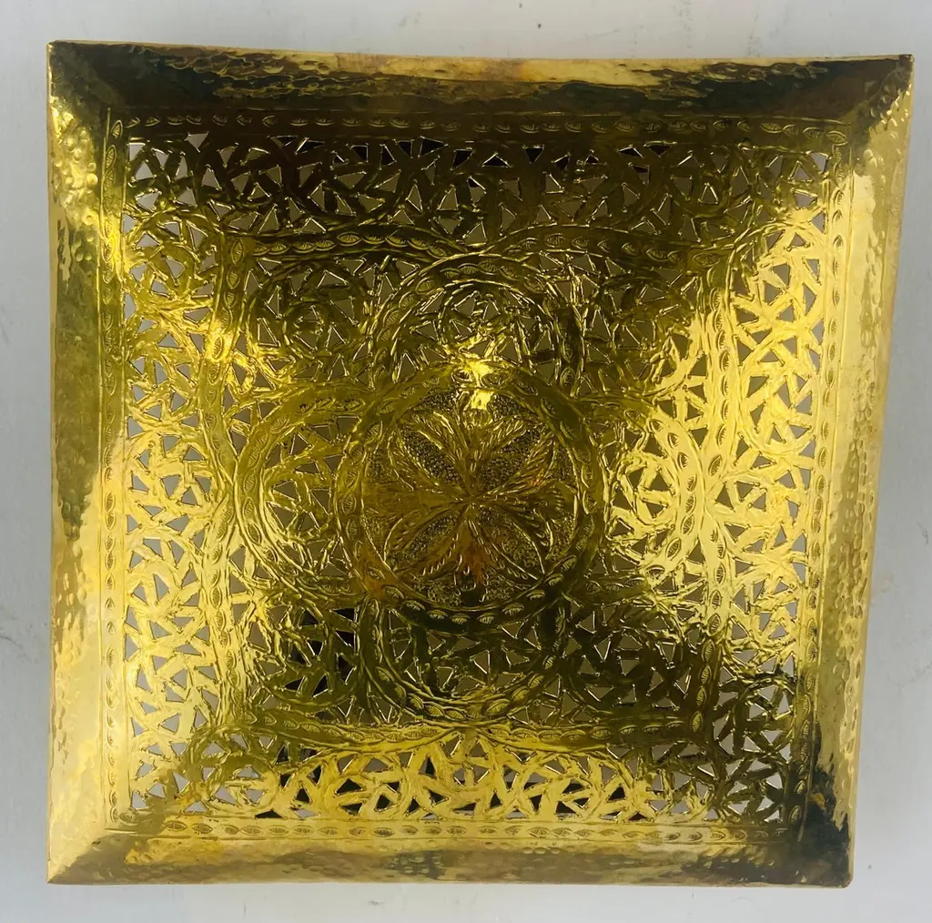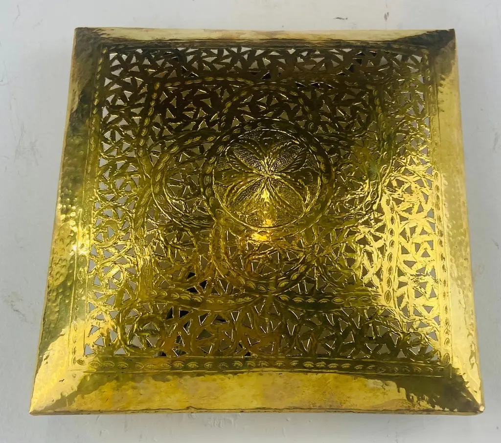 A one of a kind pair of Hollywood Regency style sconces. The stylish pair of sconces is handmade of high quality gold brass and designed in a fine filigree motifs. The square shape of the sconces is desirable and can match and elevate any interior design and style. The sconces have been recently polished as well as wired and are UL listed. The sconces will look wonderful in a foyer, entry hall, or any room. Dimensions: 9.25" by 9.25".