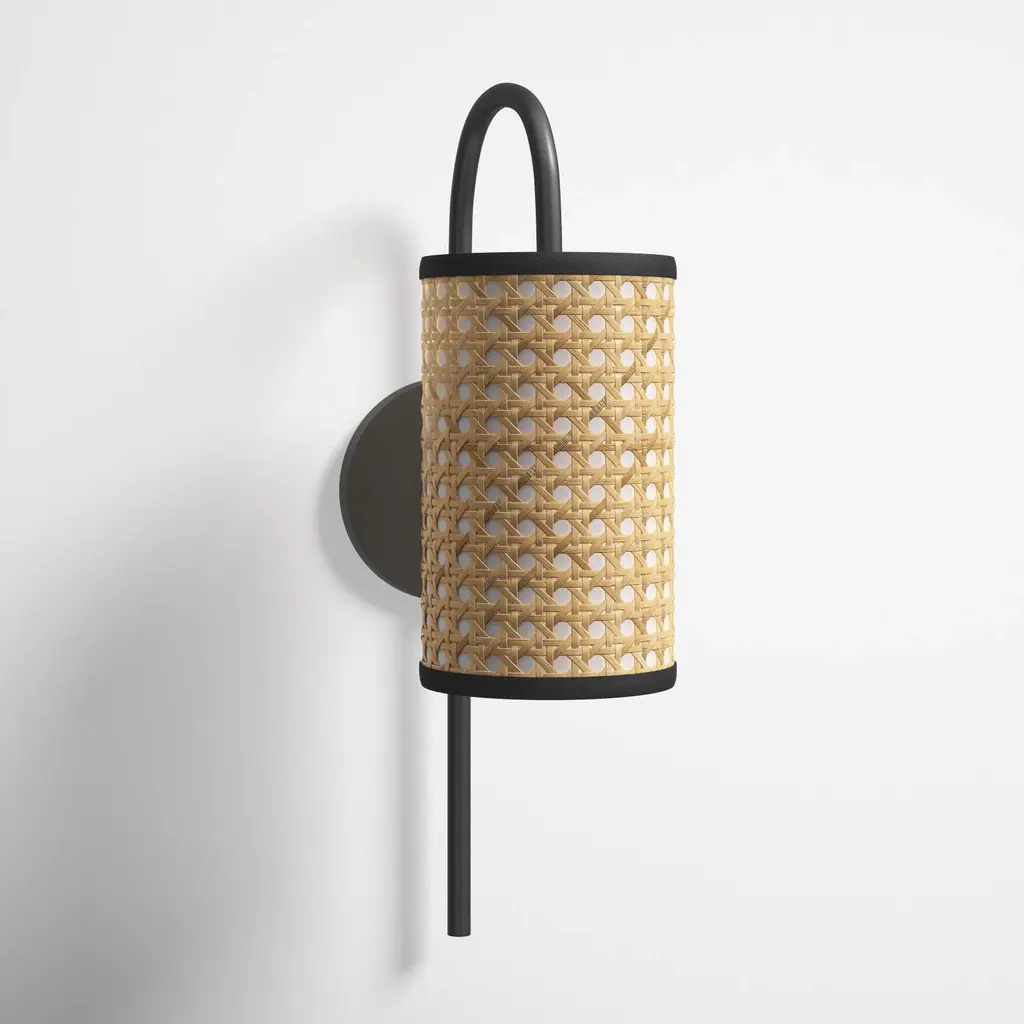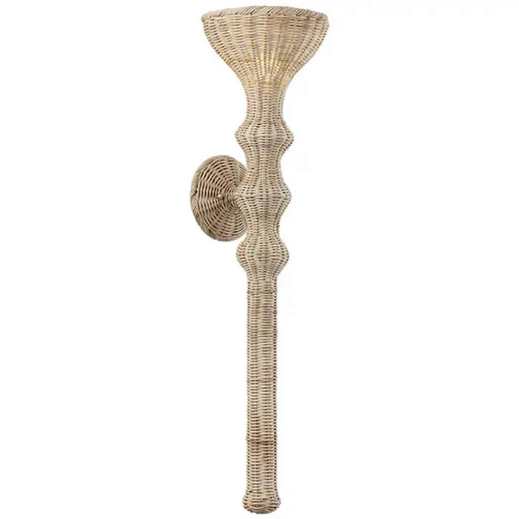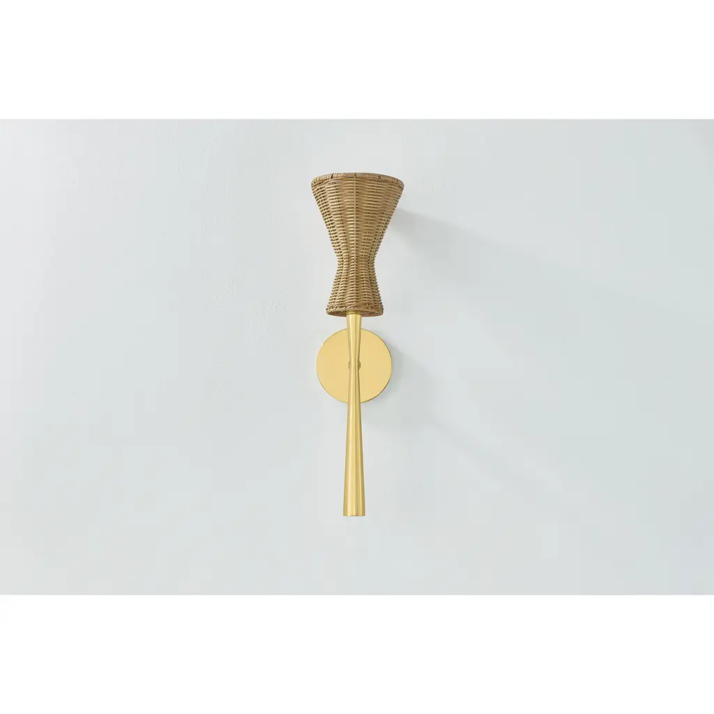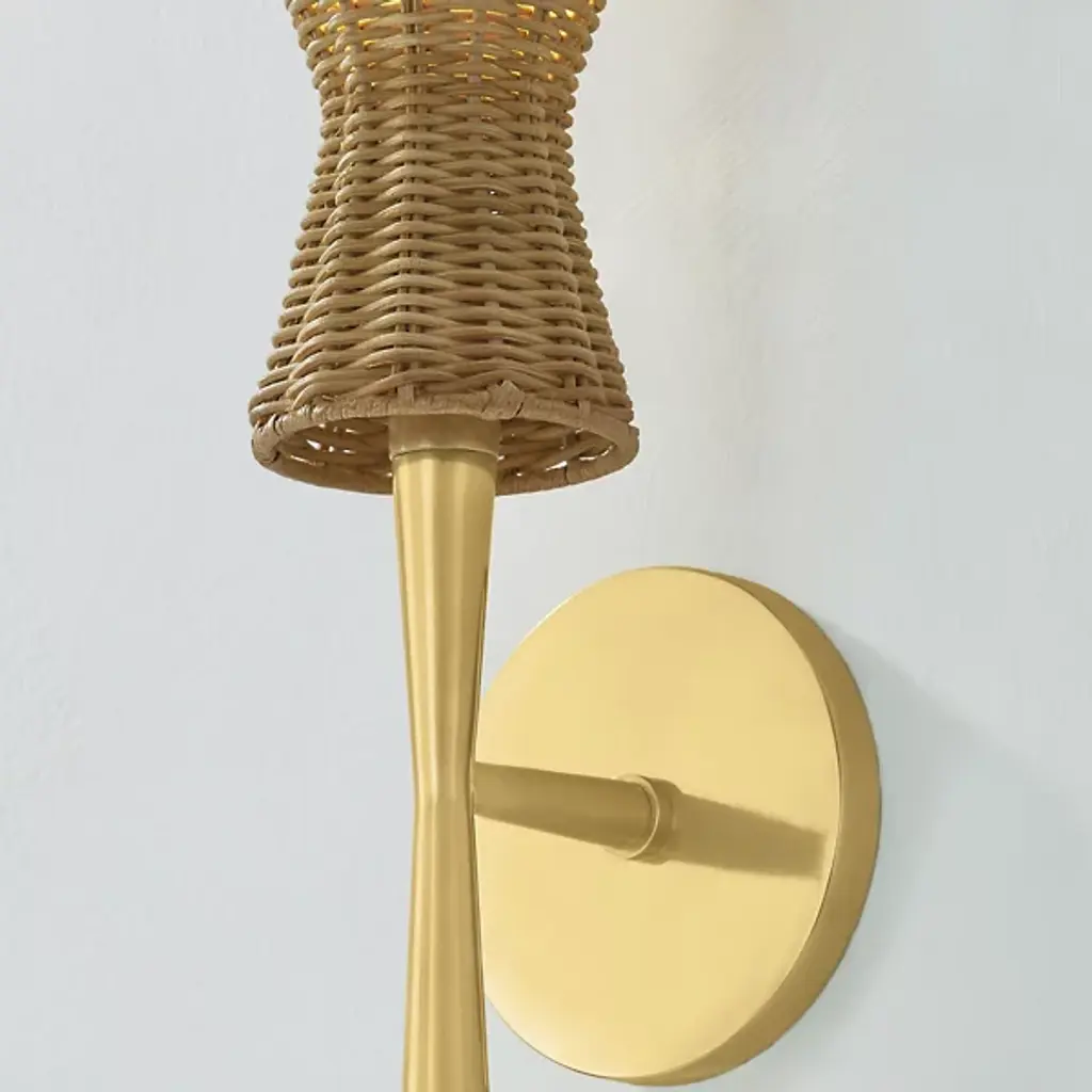 The Honey Wall Sconce from Mitzi blends transitional and bohemian styles with a sweet, nature-inspired elegance. This charming sconce reimagines mid-century conical shapes using natural wicker. Both shade and stem taper inward, forming subtly asymmetrical hourglass silhouettes. Made in Vietnam, its decadent design intersects with handmade craftsmanship, allowing delightful accent light to create a warm and inviting atmosphere.