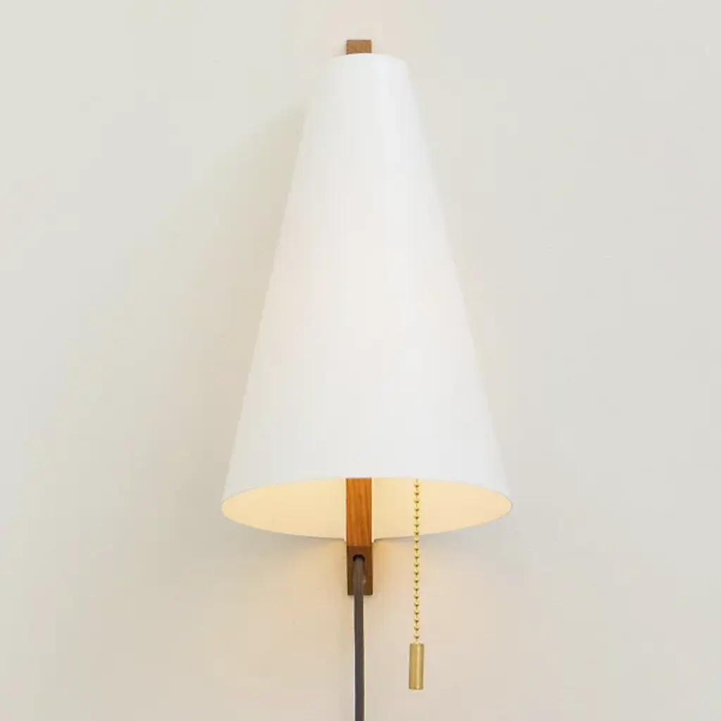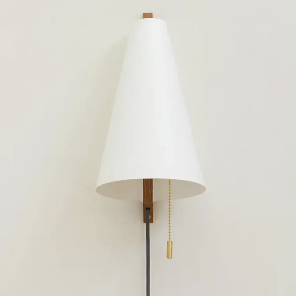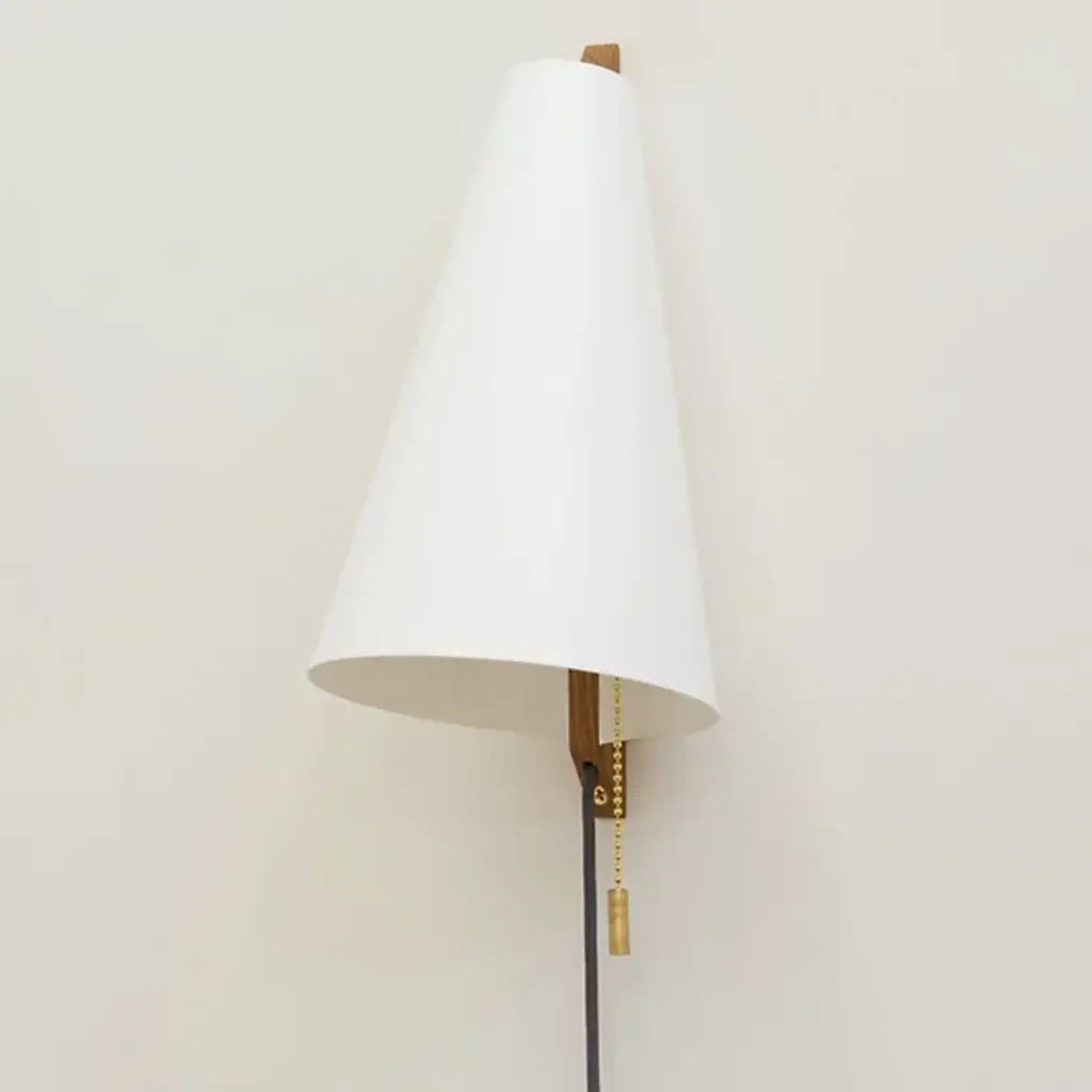 The Hood Plug-In Wall Sconce from Ravenhill Studio draws inspiration from traditional wooden sailboats and the design sensibilities of Aino Aalto. A single sheet of white polyethylene is precisely die-cut, bent, and bolted to a slender wooden spine, creating a lightweight yet structured form around damp-listed lamping activated by a pull chain switch. The hooded shade softly diffuses light, evoking the sunlit glow of sails in motion. Brass hardware completes the three-part material palette, adding warmth and contrast while maintaining an airy, attractive design.