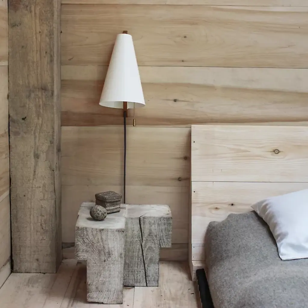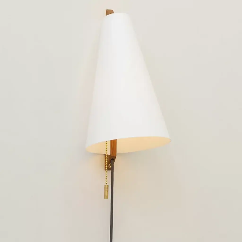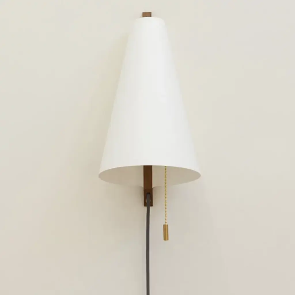 The Hood Plug-In Wall Sconce from Ravenhill Studio draws inspiration from traditional wooden sailboats and the design sensibilities of Aino Aalto. A single sheet of white polyethylene is precisely die-cut, bent, and bolted to a slender wooden spine, creating a lightweight yet structured form around damp-listed lamping activated by a pull chain switch. The hooded shade softly diffuses light, evoking the sunlit glow of sails in motion. Brass hardware completes the three-part material palette, adding warmth and contrast while maintaining an airy, attractive design.