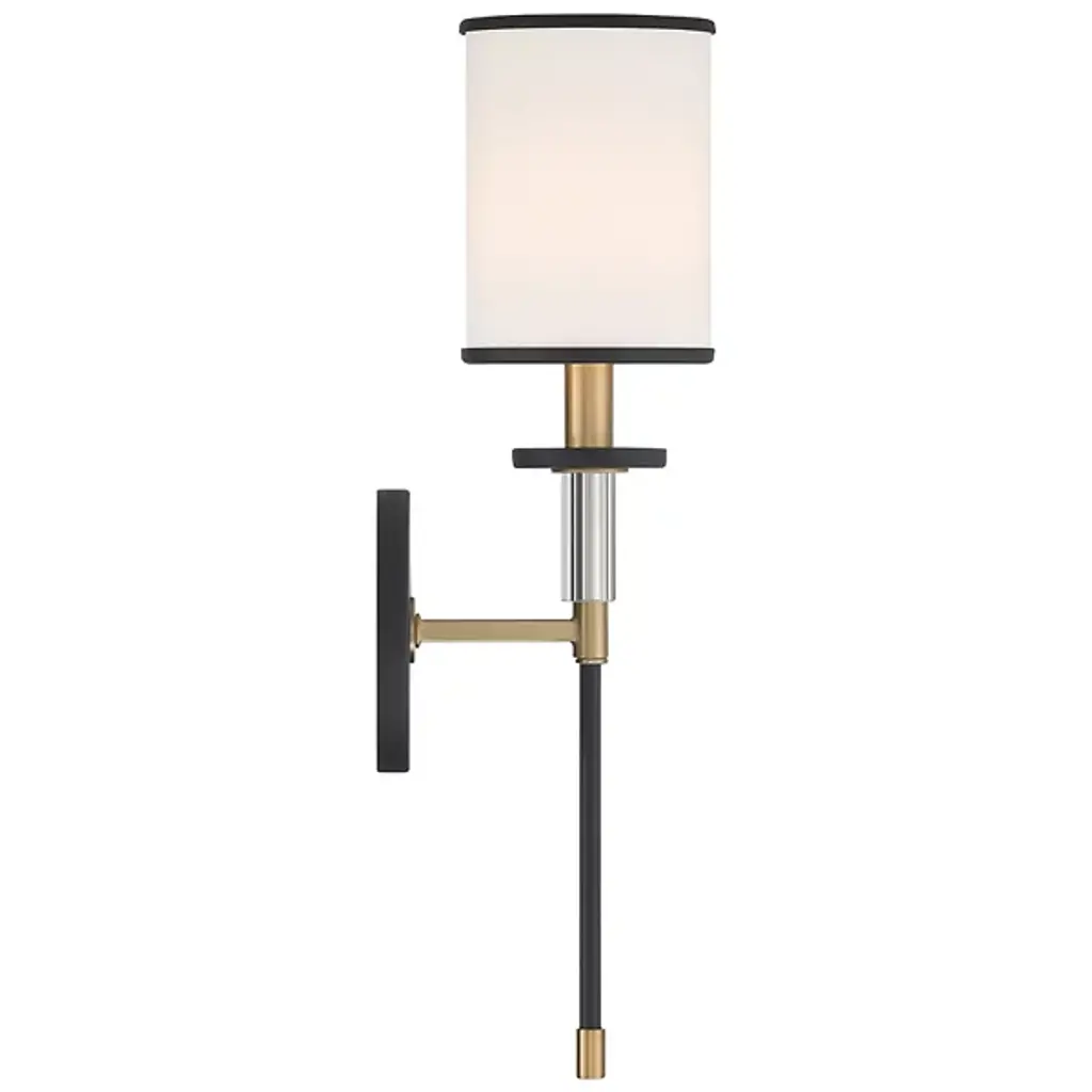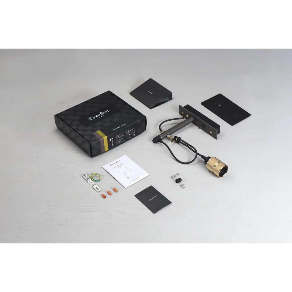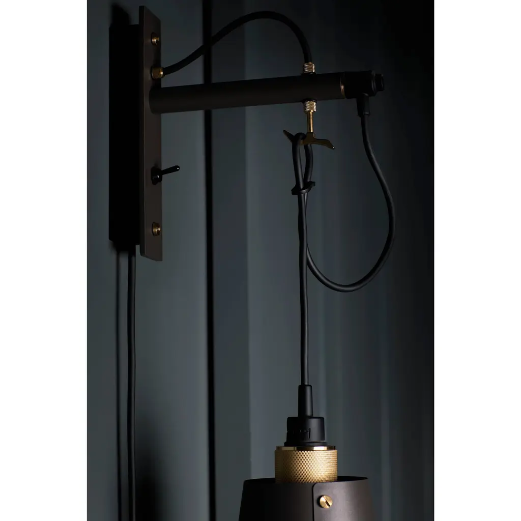 A wall light made from graphite powder coated metal with solid brass detailing.