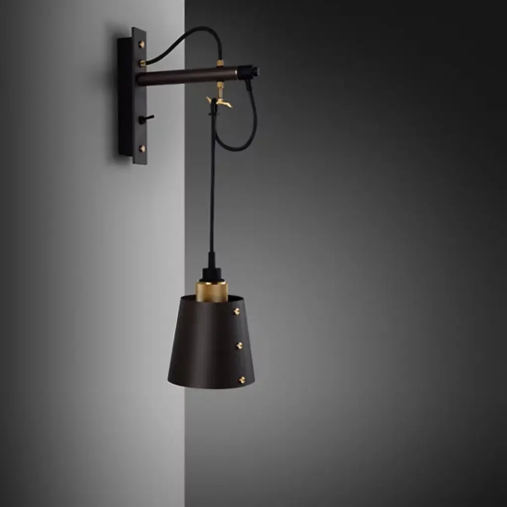 Present lasting industrial appeal to an interior wall with the Hooked Small Graphite Wall Sconce from Buster + Punch. Secured via a stepped rectangular wall plate, it extends a slim stem out to the side, sending a solid metal hook below that gives the fixture its name. A slender woven cord arcs out and around the hook to a Buster + Punch signature socket, extending a riveted metal shade around its lamping, which is activated by a tasteful toggle switch and blazes out below as a focused downlight. The small shiny elements contrast well with the matte metal, adding detail and expressiveness to its overall ensemble.