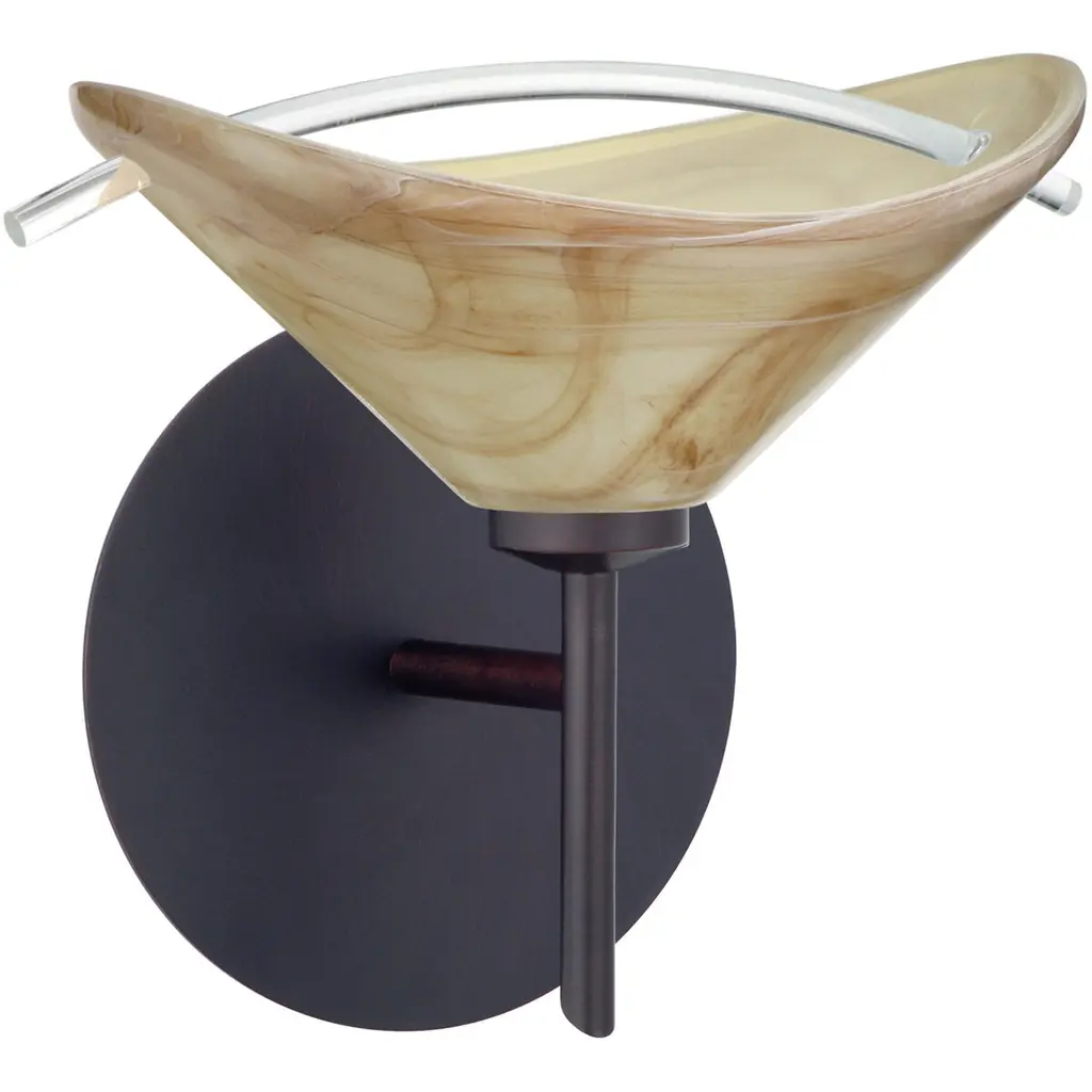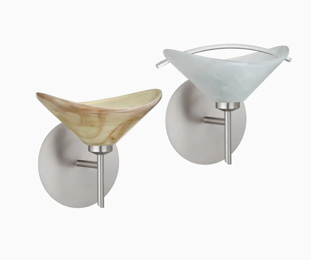 The Hoppi features a wide cone-shaped glass, that demonstrates contemporary sensibilities. Our Mocha/Clear glass is a pressed glass that features a cream color that is marbleized with brown. An arched clear rod acts an accent, beautifully playing with the illumination of the fixture. When lit this gives off a light that is functional and soothing. The smooth satin finish on the clear outer layer is a result of an extensive etching process. This handcrafted glass uses a process where every glass is consistently produced using a press mold, keeping variations to a minimum. The mini sconce is equipped with a decorative lamp holder mounted to either a low profile round or square canopy. These stylish and functional luminaries are offered in a beautiful Chrome finish.