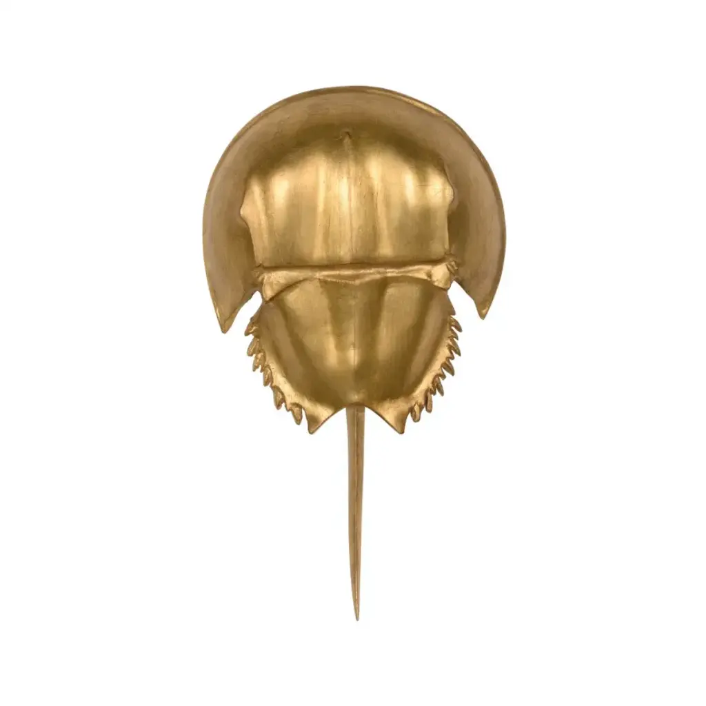 This unique horseshoe crab wall sconce brings a touch of coastal charm and natural beauty to your space. Expertly crafted to capture the intricate details of a real horseshoe crab, the sconce features a beautifully textured design that mimics the creature’s distinctive shell, finished in a luxurious gold. The sconce emits a warm, ambient light that creates a cozy and inviting atmosphere. Perfect for beach-inspired or nature-themed interiors. ADA Compliant.