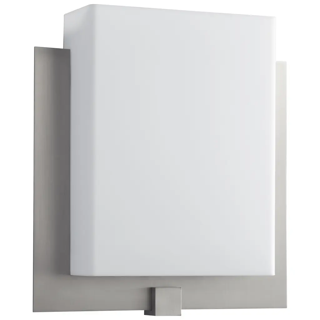 Single LED wall sconce with rectangular shaped white opal glass. Metal details in brushed nickel or chrome finish, and is equipped with our powerful 120V AC LED technology