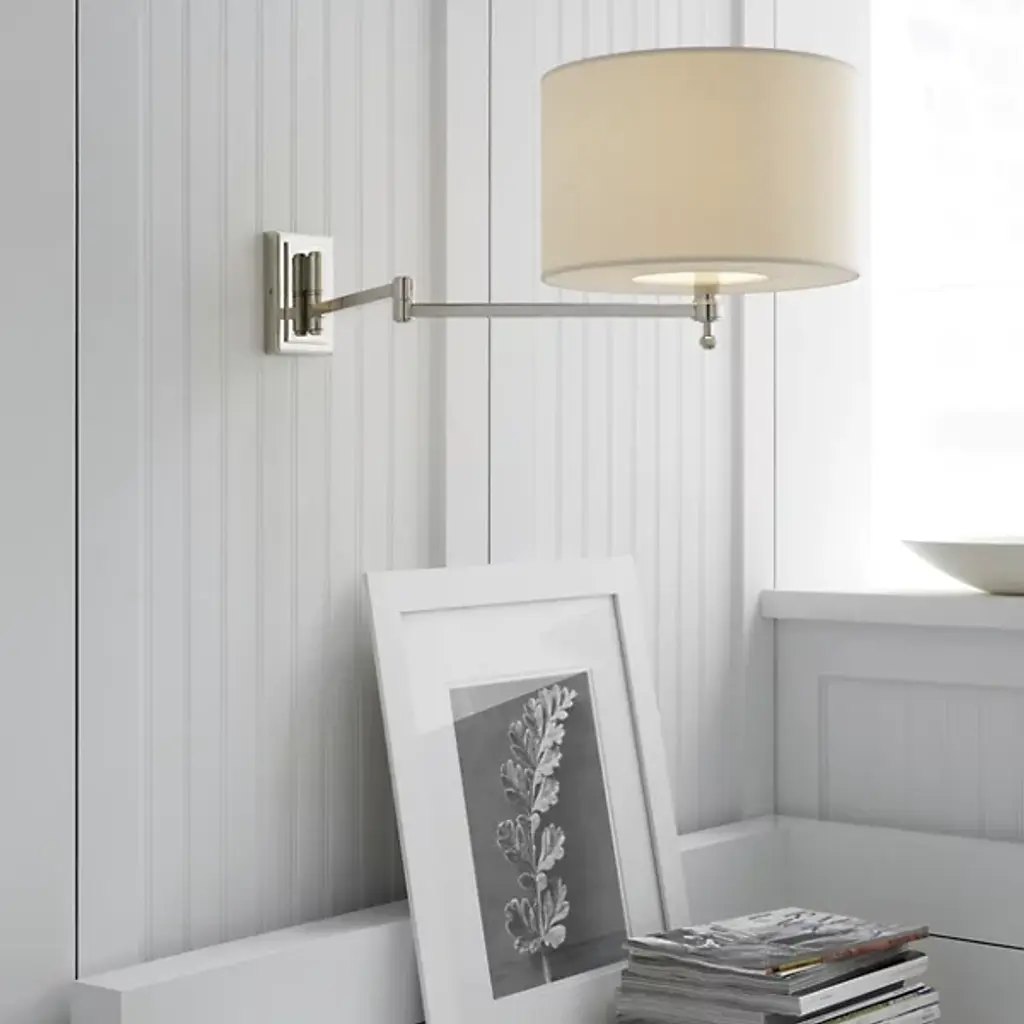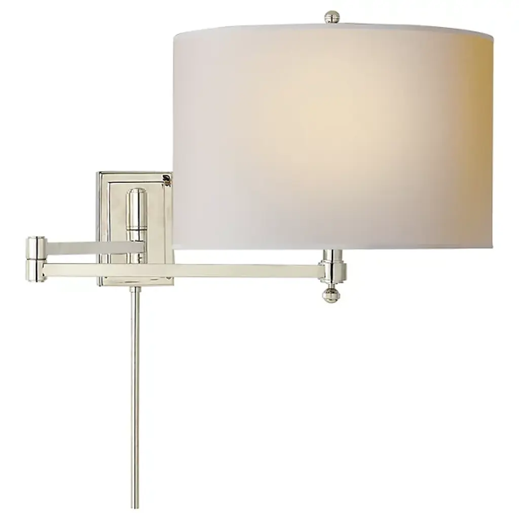 The Hudson Swing Arm Wall Sconce by Visual Comfort Signature, formerly known as Visual Comfort, features a large, Natural Paper drum shade, decorative finials and classic swing arm design. Extension of over 2 feet from the wall allows significant control of placement of light. Plug-in installation along with included cord cover make this fixture perfect for updating your home’s lighting. Direct Wire plug included.