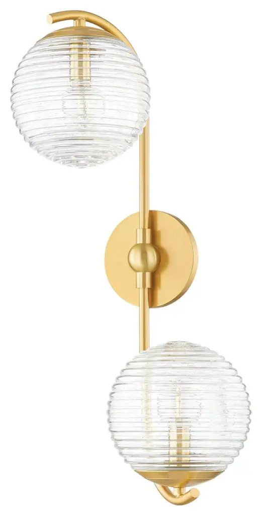 One Light Wall Sconce from Calypso collection in Aged Brass finish. Number of Bulbs 1. Max Wattage 60.00. No bulbs included. Whimsical and youthful, fresh and modern, Calypso brings big top flair to the space it lights up. A celebration of fun and geometry, its maximalist aesthetic with fluted-spiral hollow glass orbs and crackle-glass sphere diffusers makes it a wow-factor fixture which will stand out in a room with more restrained design. No UL Availability at this time.