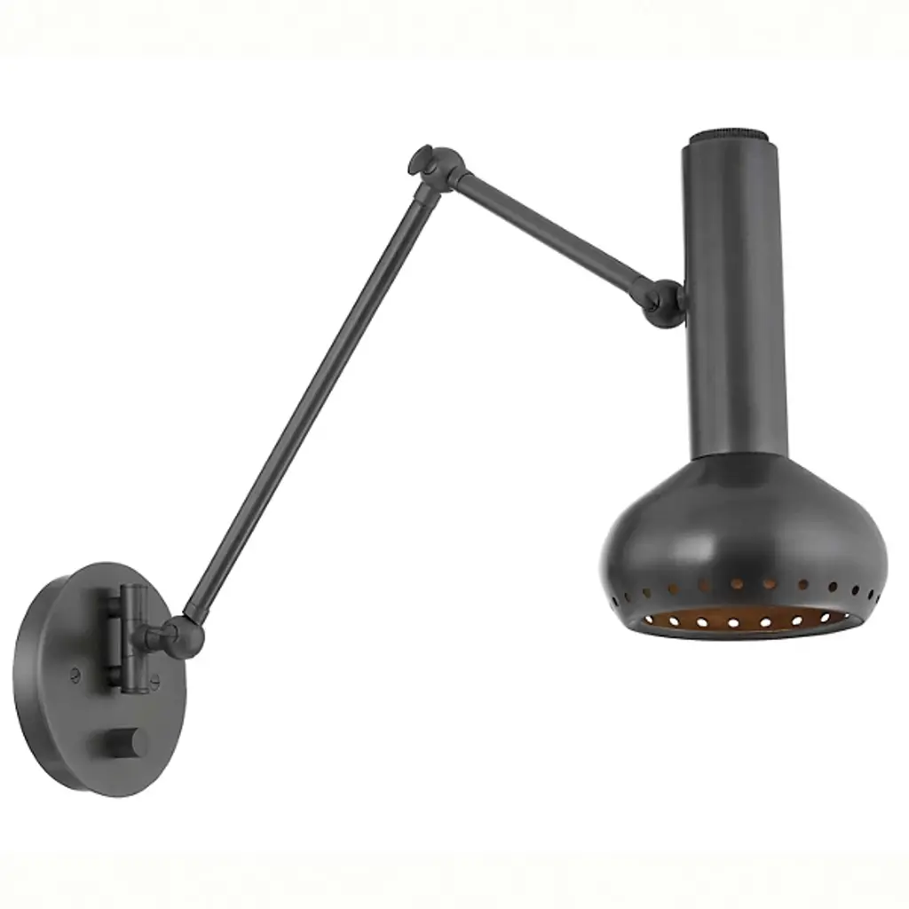 The atomic curves, metal detailing, and slender, adjustable arm of Roald nod to its mid-century inspiration. Ideal as a reading light in a bedroom or office, this versatile sconce features a gourd-shaped shade with decorative perforations. Choose from an Aged Brass or Distressed Bronze finish to complement your decor.