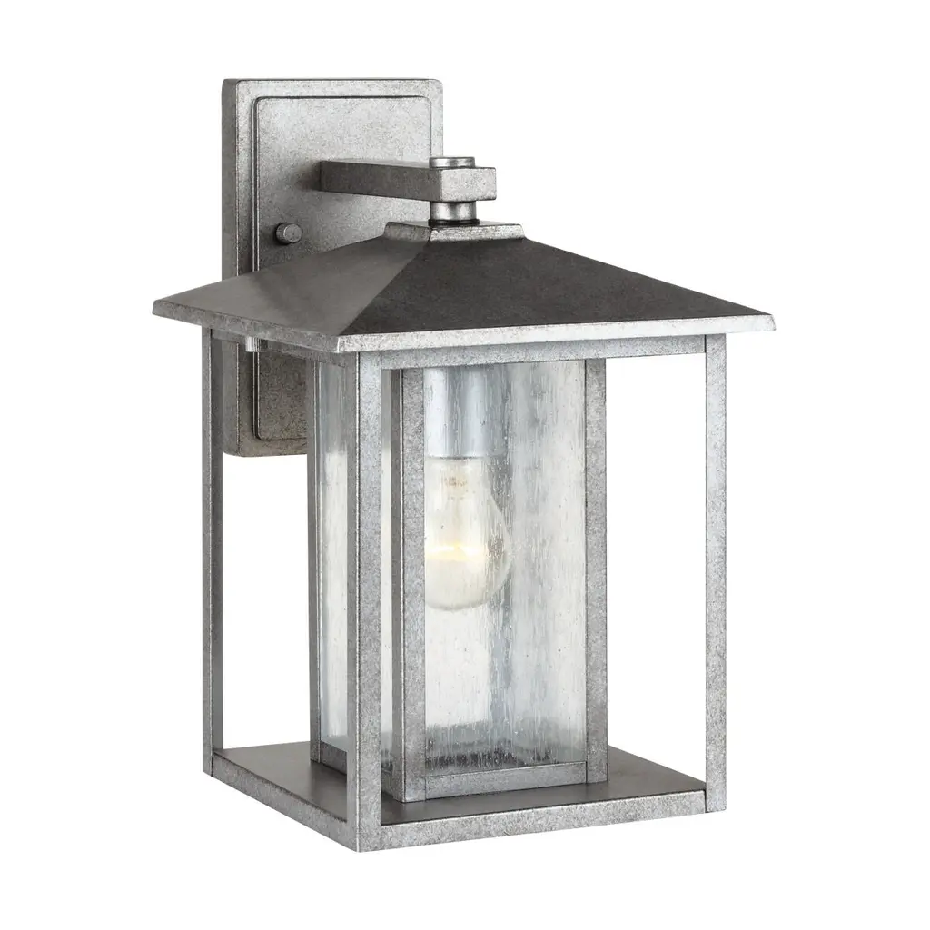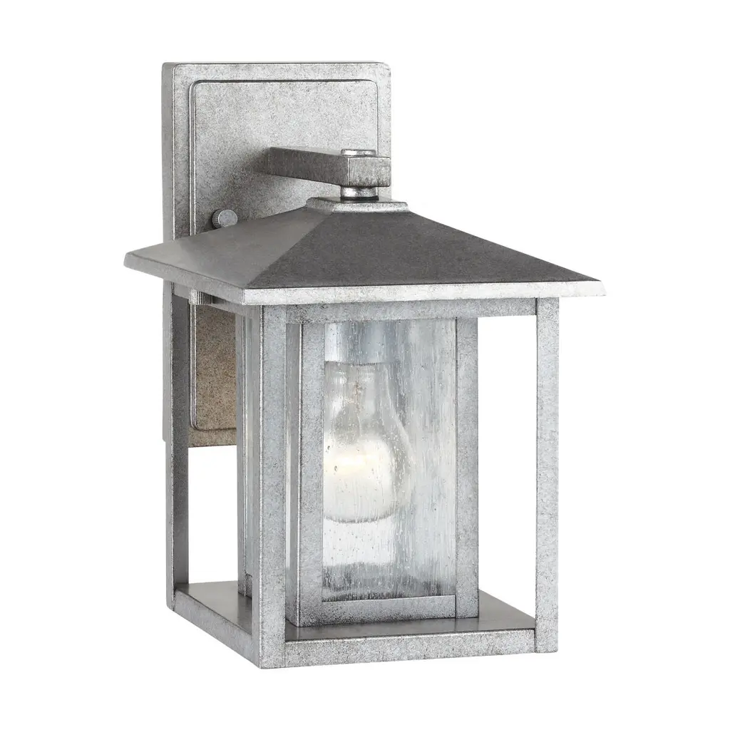 The Hunnington Outdoor Wall Sconce with Clear Seeded Glass by Generation Lighting, formerly known as Sea Gull Lighting, mixes elements of Arts and Crafts style with Shaker minimalism. Employing superior attention to detail, geometric lines, and Clear Seeded glass panels this fixture will offer a certain upgrade to your exterior spaces. Install with a vintage Edison bulb to enhance the look.