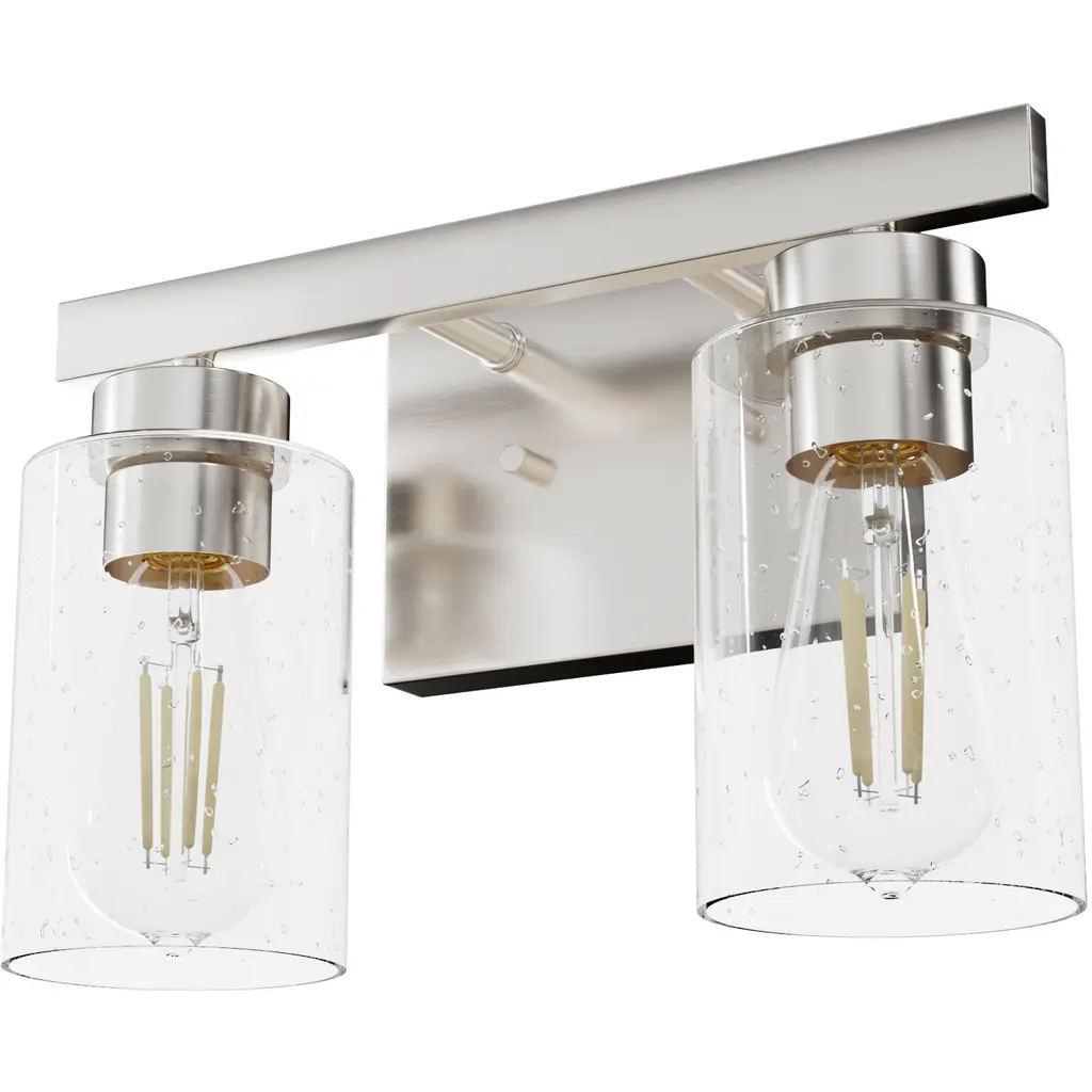 Material: Metal, Finish Color: Brushed Nickel, Width: 12.5", Height: 9", Length: 6", Backplate Width: 8.25", Backplate Length: 4.25", Lamping Type: Incandescent, Number Of Bulbs: 2, Wattage: 60 Watts, Dimmable: No, Moisture Rating: Dry Rated